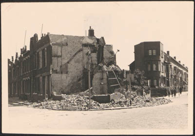 Vernielde woningen in de meidagen van 1940 op de hoek van …