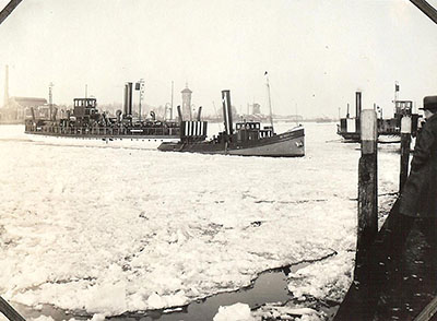 IJsreker En Avant en veerboot op de Oude Maas. Op de …