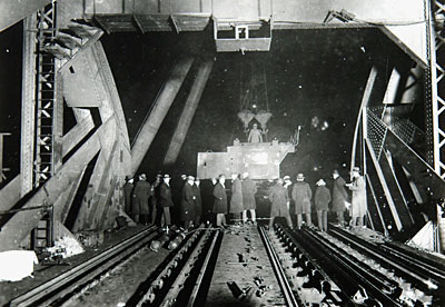 Een stoomtrein op het draaibare gedeelte van de spoorbrug …