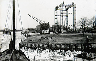 Huizen aan het dokhaventerrein; op de achtergrond is de …