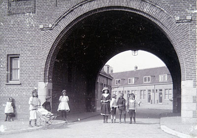 Spelende kinderen bij de overkapping van de huizen aan de …