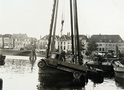 Een vrachtwagen wordt uit de Kalkhaven getakeld
