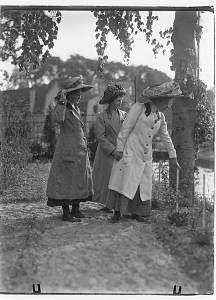 Drie dames met hoeden in een tuin