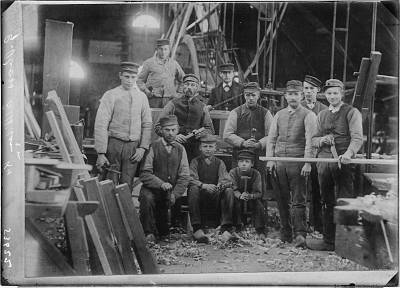Groepsfoto van timmerlieden in hun werkplaats in …