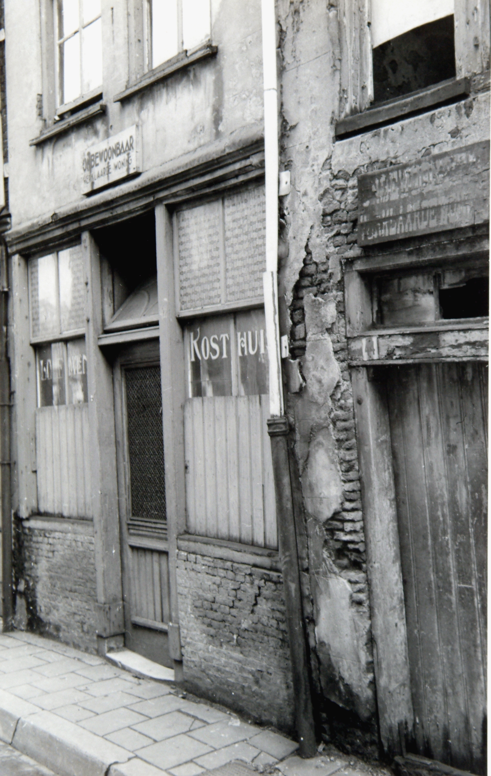 Onbewoonbaar verklaarde woningen in de Torenstraat tussen Nieuwkerksplein en Wijngaardstraat. Het huisje rechts stond bekend als "De bocht van Guinee".