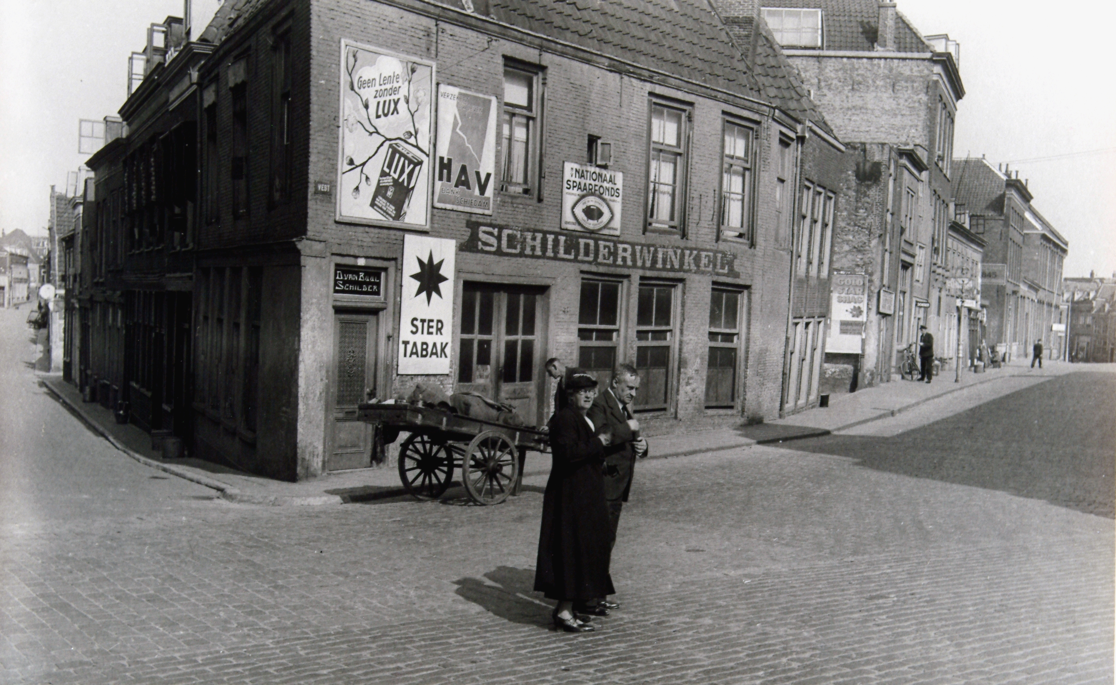 - De Vest vanaf de Noorderbrug richting Nieuwkerksplein. Links de Heer Heymansuysstraat met op de hoek schildersbedrijf D. van Buul.