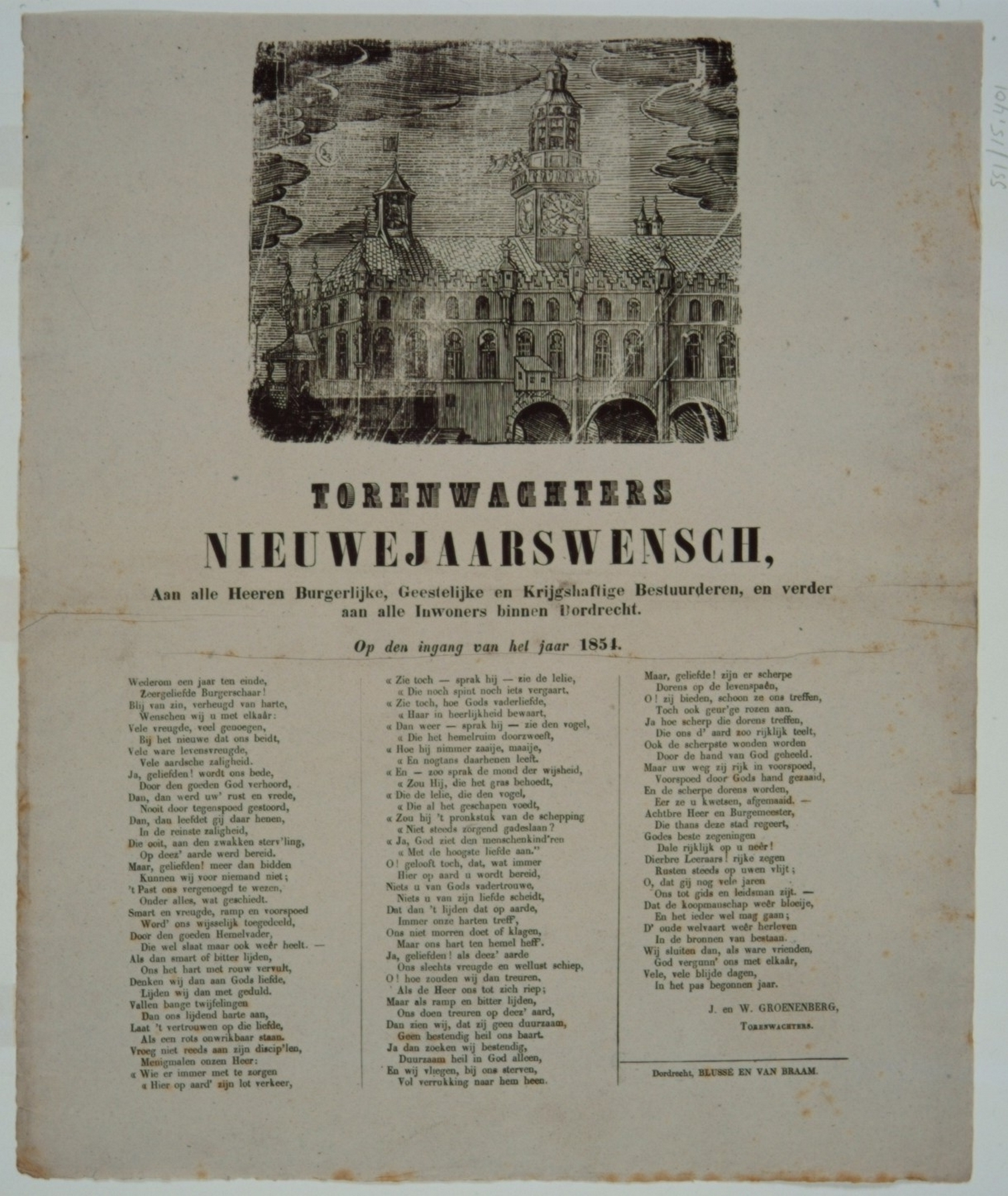 - Nieuwjaarswens van de torenwachters voor het jaar 1854 met een afbeelding van het Stadhuis vóór 1671 en een gedicht in drie kolommen door J. en W. Groenenberg.