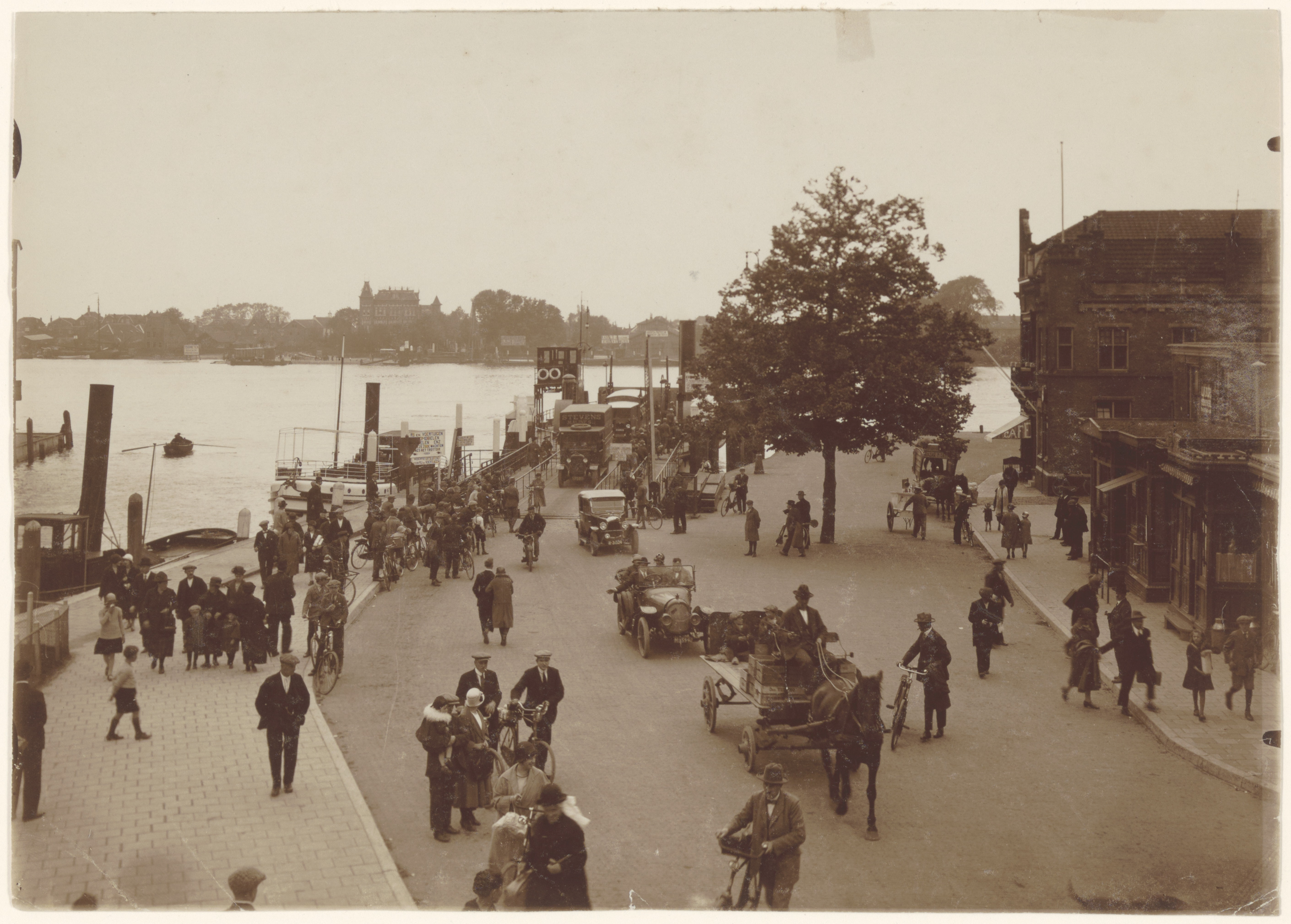 - cafés fietsers handkarren hotels oldtimers paard-en-wagens ponten / veerboten reizigers veerdiensten veersteigers