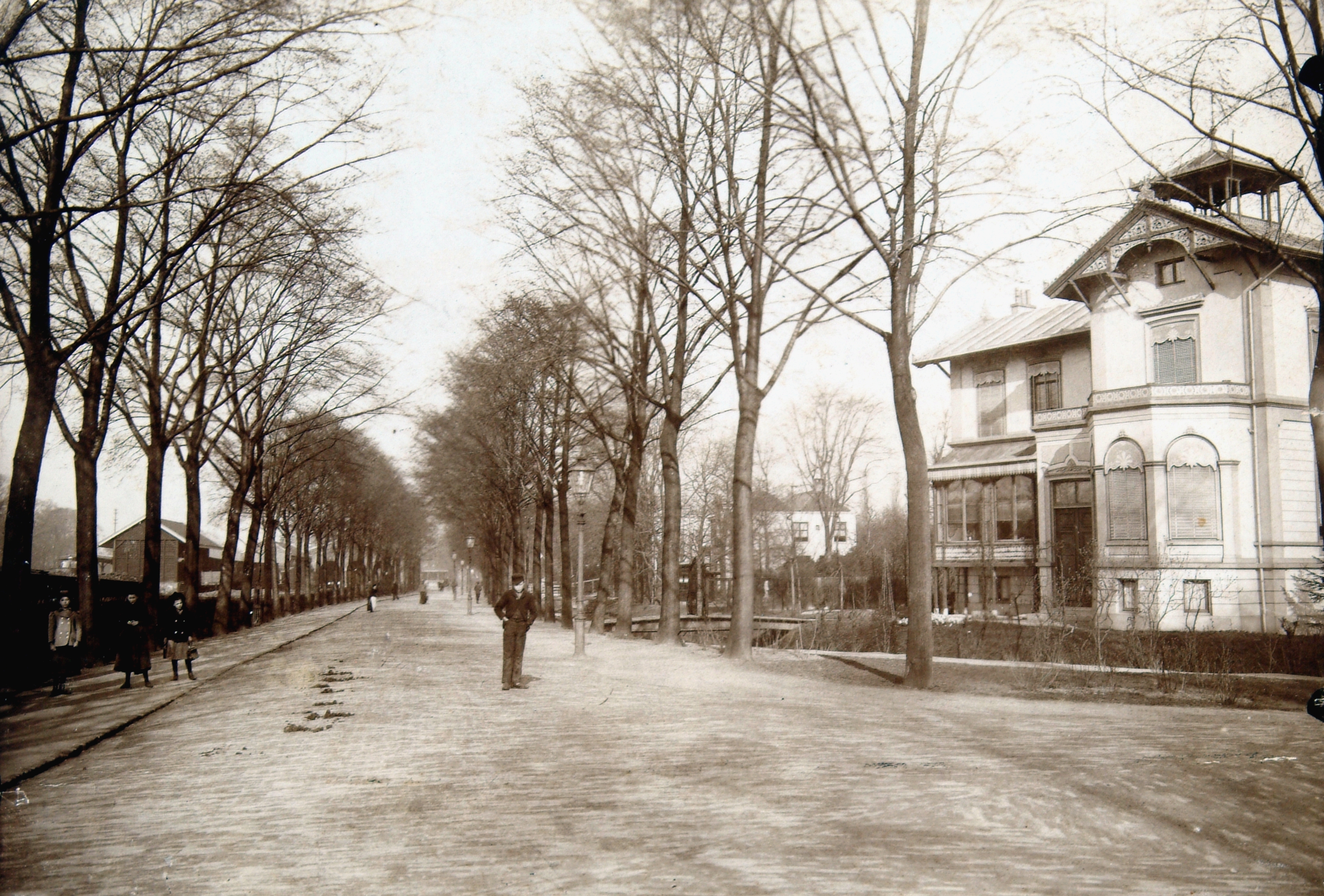 - De Burgemeester de Raadtsingel gezien in de richting van de Spuiweg. Rechts de villa Spoorzicht op de hoek van de Dubbeldamseweg.