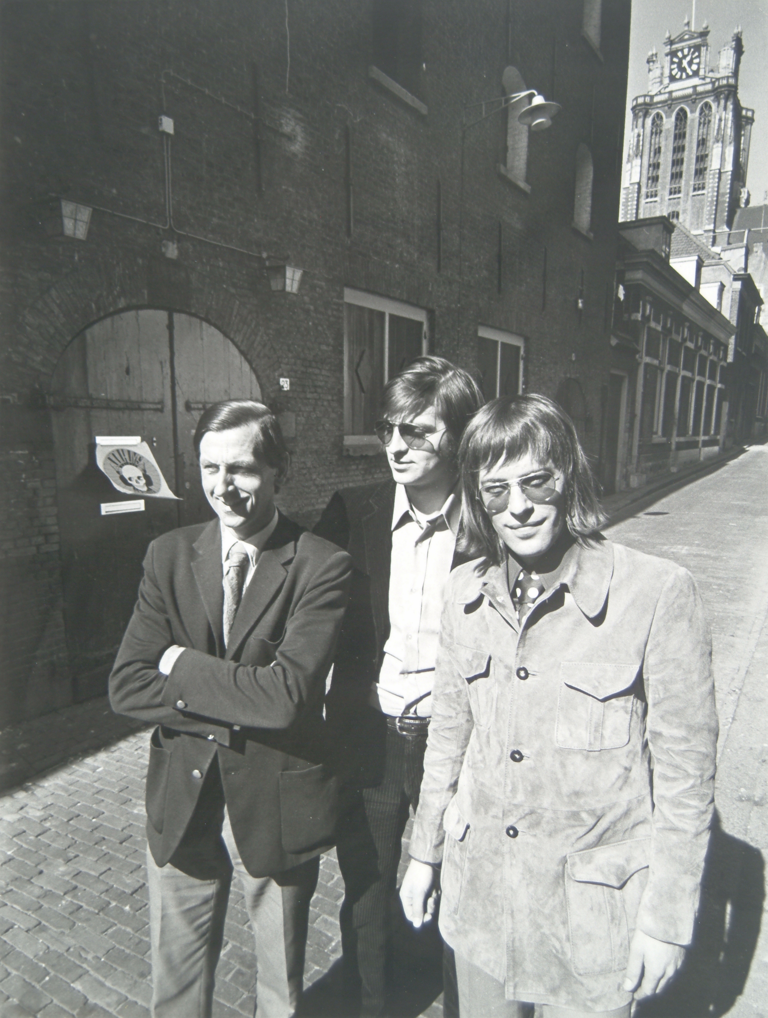 - Groepsportret de drie oprichters van sociëteit Dolhuys voor het voormalige café aan de Dolhuisstraat. Vlnr P.J.W. Nuyten, Mario Crijns en Han Elzerman