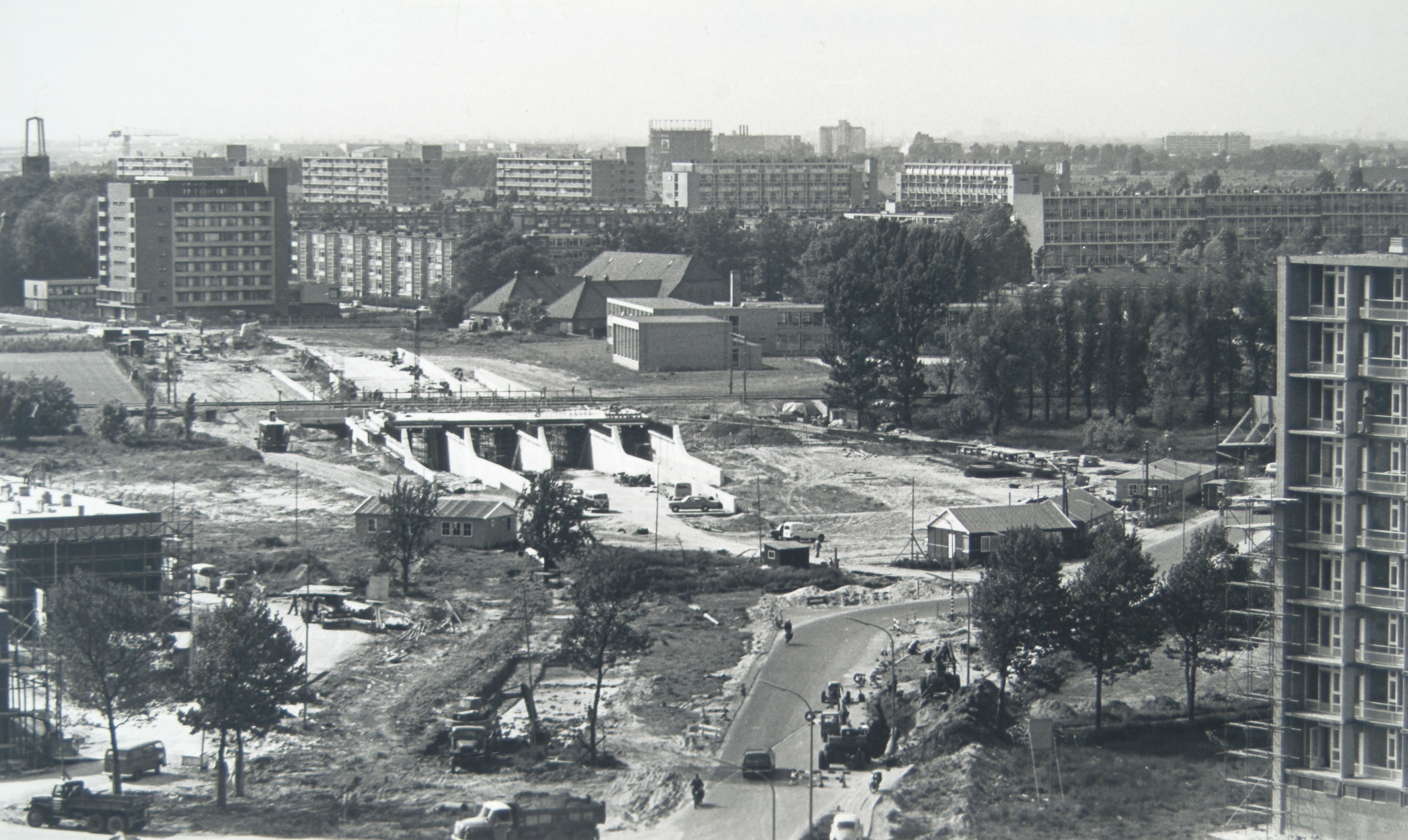 - Bouw van de Sterrenburgtunnel onder de spoorweg als verbinding tussen de Galileïlaan en S.M. Hugo van Gijnweg. Boven de manege aan de Spirea en de gashouder aan de Mijlweg. Links de Stefanuskerk aan de Talmaweg.