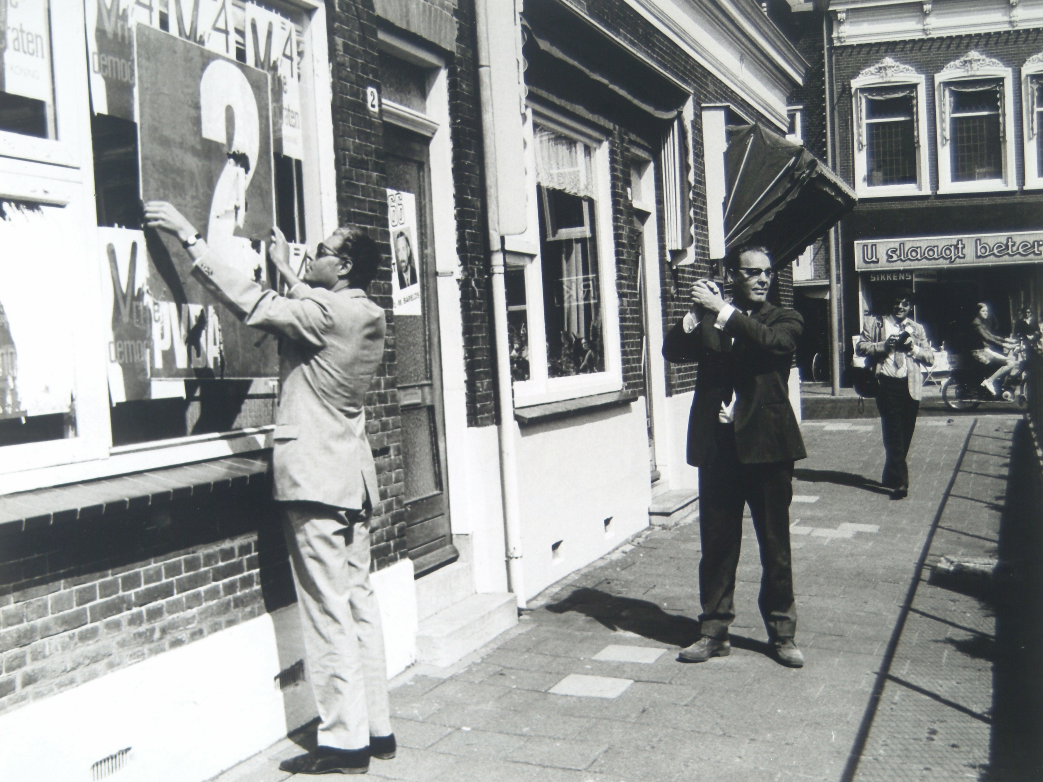 Plakker hr. Van Zuuren en handen wrijvend hr. Chiel de Koning in de Kilwijkhof (niet Kilwijkstraat).