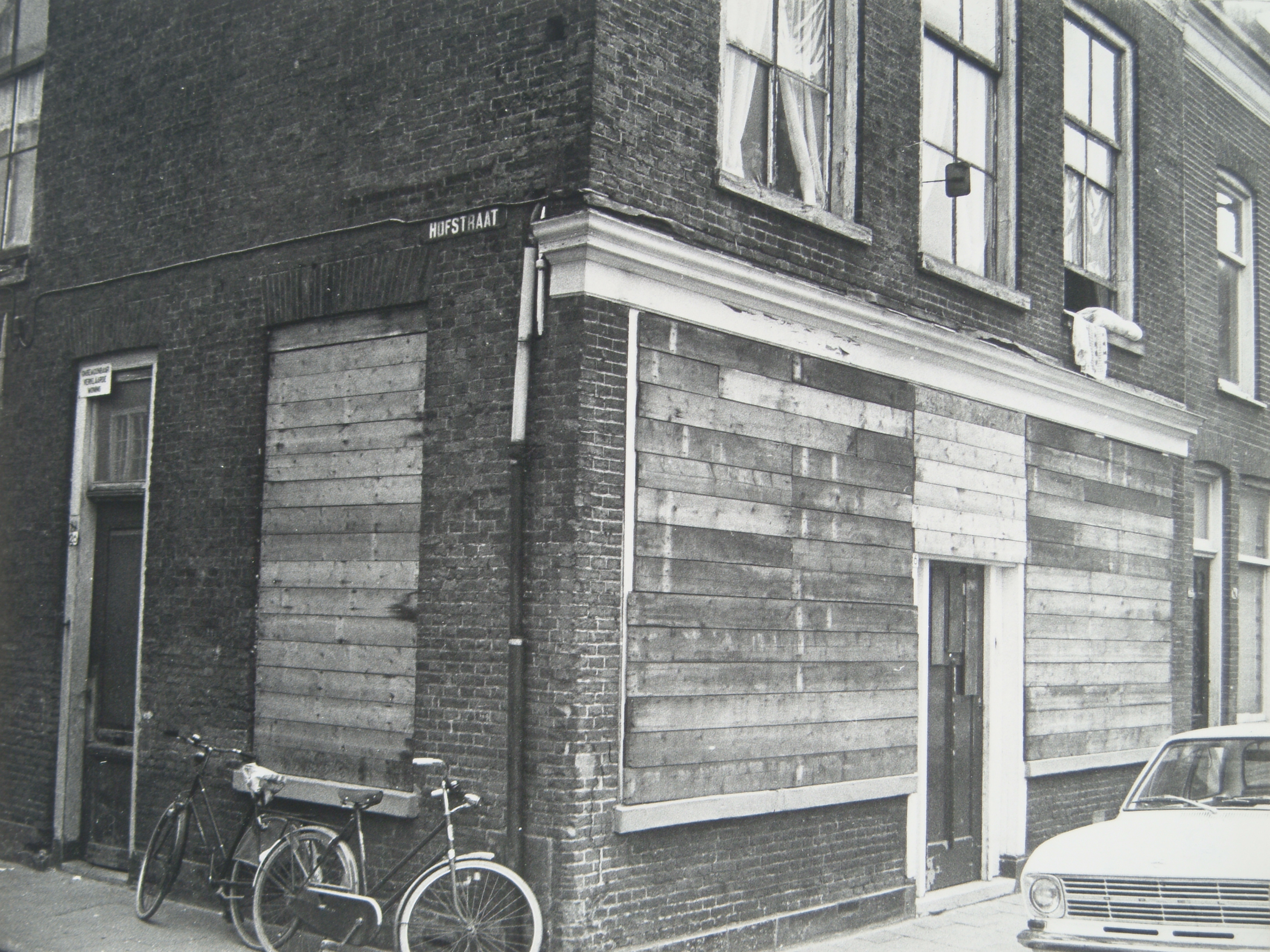 - Onbewoonbaar verklaarde, dichtgetimmerde en desondanks door kamerbewoners bewoonde woning op de hoek Hofstraat/Nieuwstraat