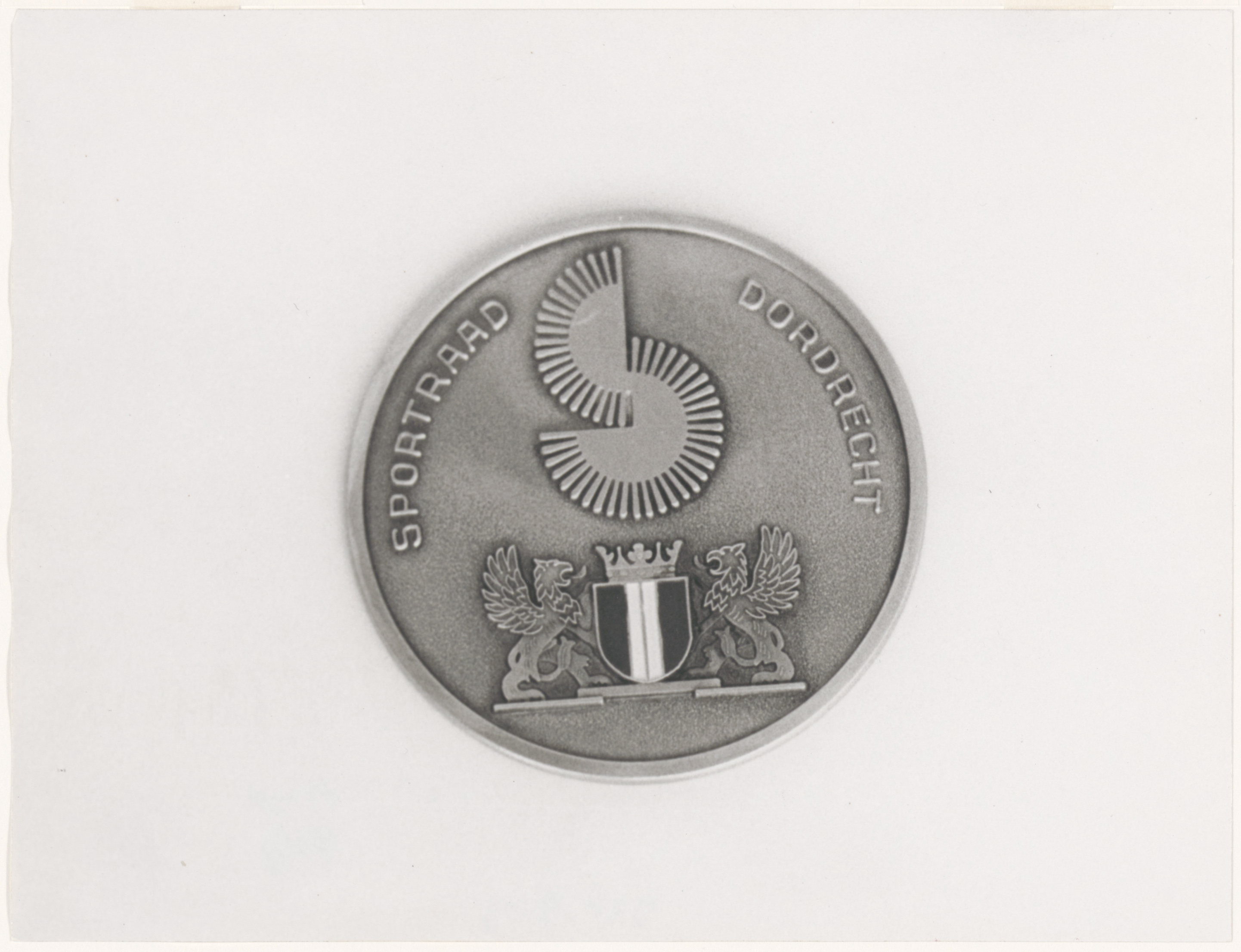 - Medaille van de Sportraad Dordrecht met het stedelijk wapen, een symbool en 'Sportraad Dordrecht' in reliëf.