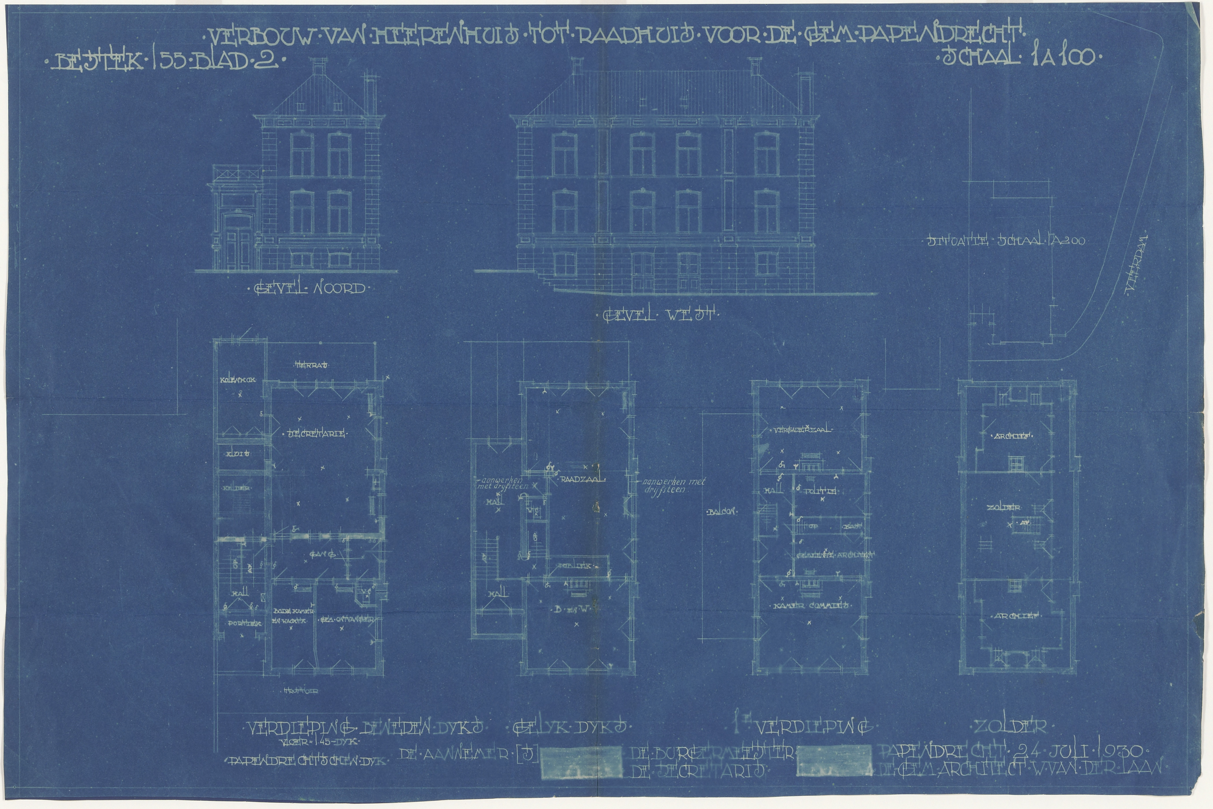 - Bouwtekening van het huis van notaris Gomm aan de Papendrechtse Dijk te Papendrecht dat verbouwd wordt tot raadhuis.