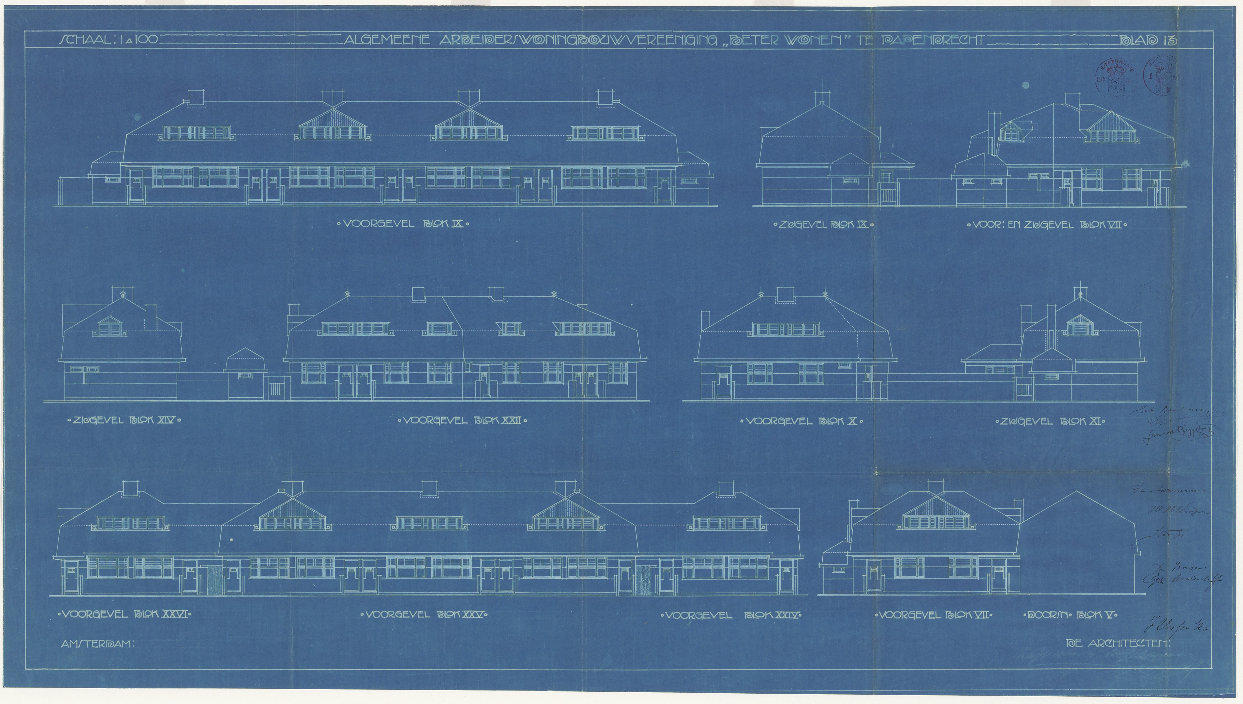 - Bouwtekening van arbeiderswoningen voor de algemene arbeiderswoningbouwvereniging "Beter Wonen" te Papendrecht voor de locatie Het Eiland, Hoofdstraat, Middenstraat, Merwedesingel, Merwedestraat en Het Plein.