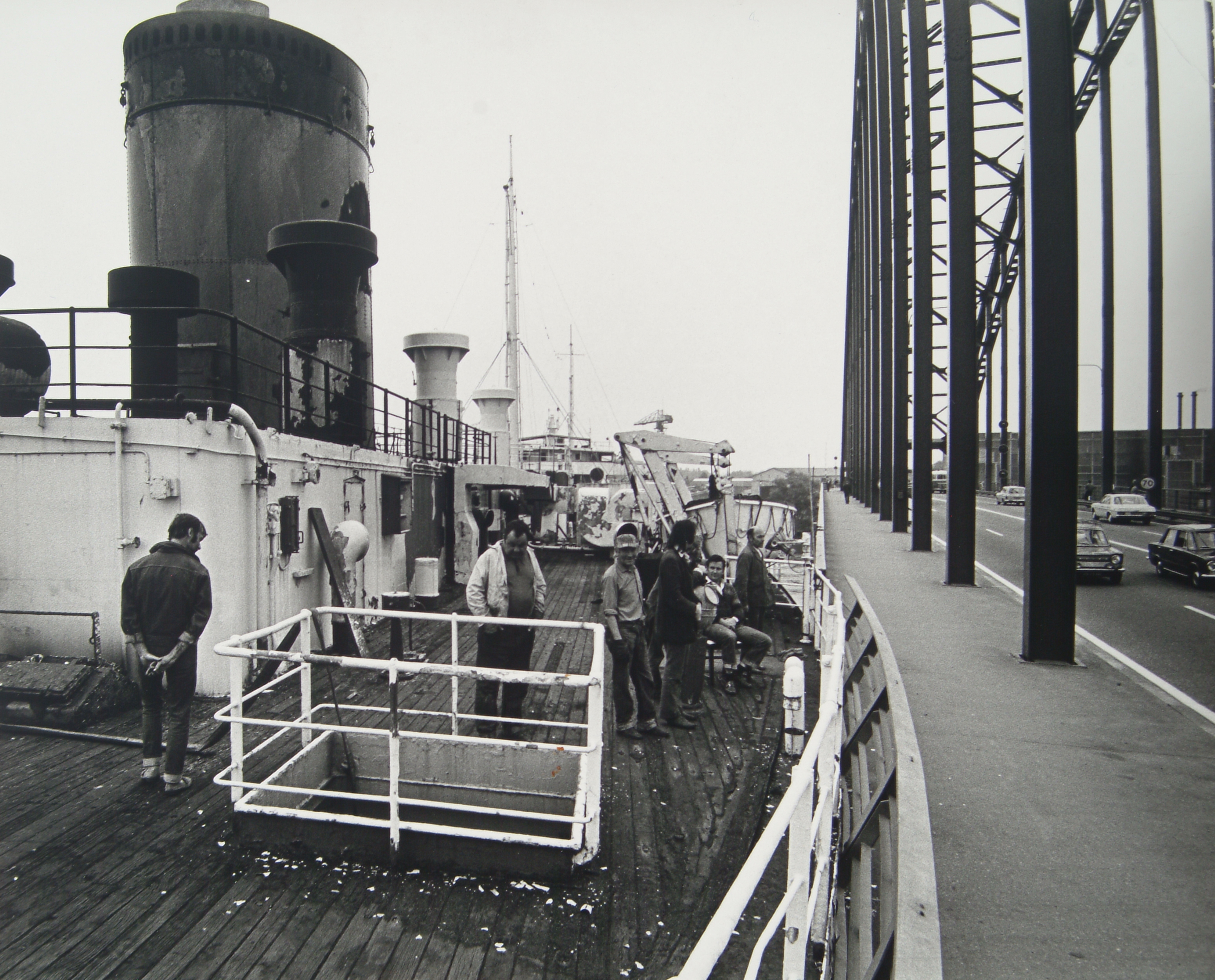 Shell tanker Velutina ( 18.000 ton, 196 m lang) is tegen de brug over de Noord bij Alblasserdam gevaren en wordt door 10 sleepboten weggetrokken