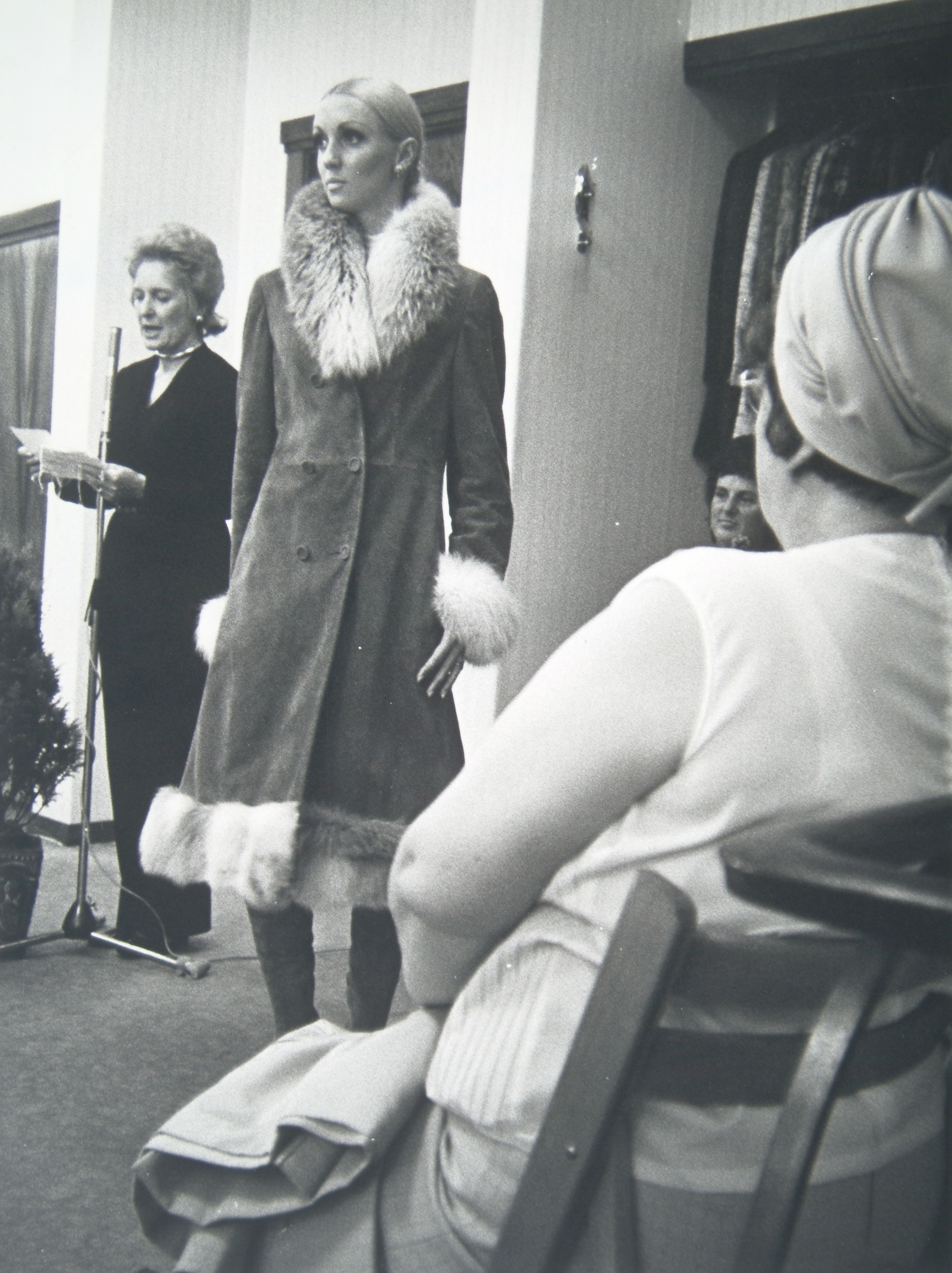 Model toont met bont afgezette suède jas tijdens de modeshow van modehuis Henri Beer …