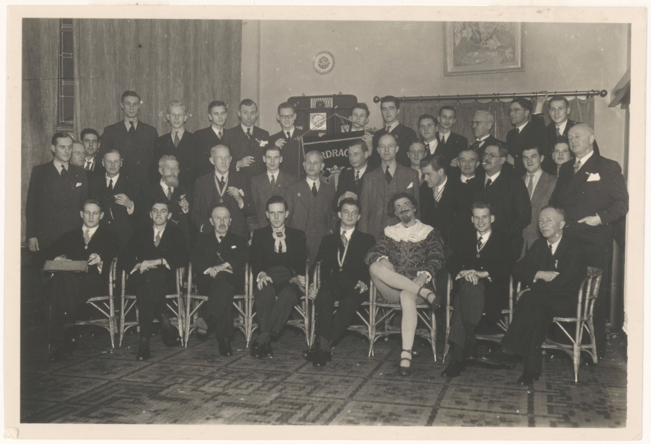 - Groepsportret van leden en voornamelijk oud-leden van studentengezelschap Dordracum (gezelligheidsvereniging van Dordtse studenten te Leiden, onderdeel van het corps Minerva, opgericht 6 mei 1858) bij gelegenheid van het 100-jarig bestaan op 28 juli 1958 (veronderstelling, gebaseerd op een feestkrant van 20 juni 1858=1958 bibl.nr. 4147); de man met baard links, sigaret in de linkerhand, is de Dordtse advocaat mr. K.K. Douw v.d. Krap.