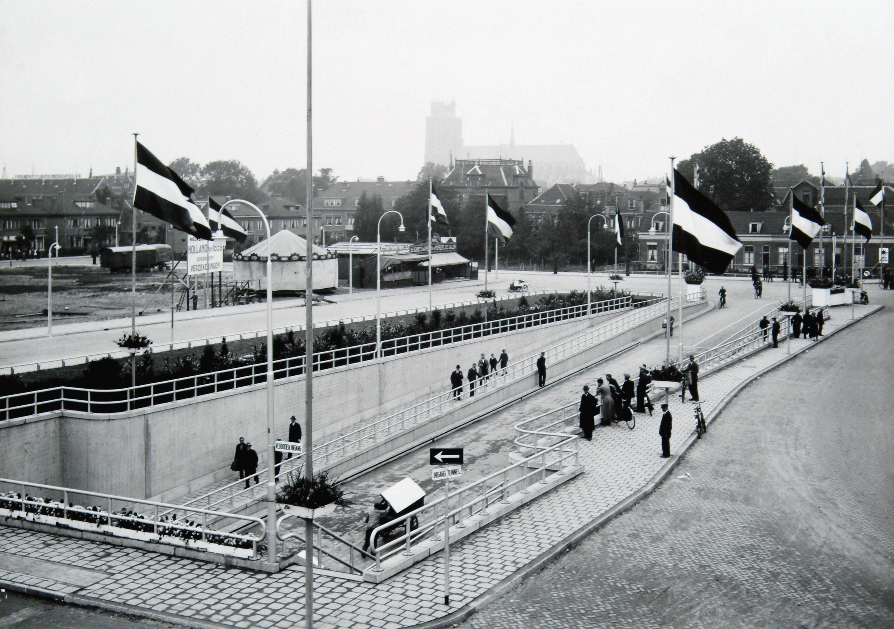 - Opening van de Krispijntunnel, gezien vanaf de voetgangersbrug over het spoor in de richting van de Spuiweg en de Kilwijkstraat. De poffertjeskraam en draaimolen bleven een week na de opening staan.