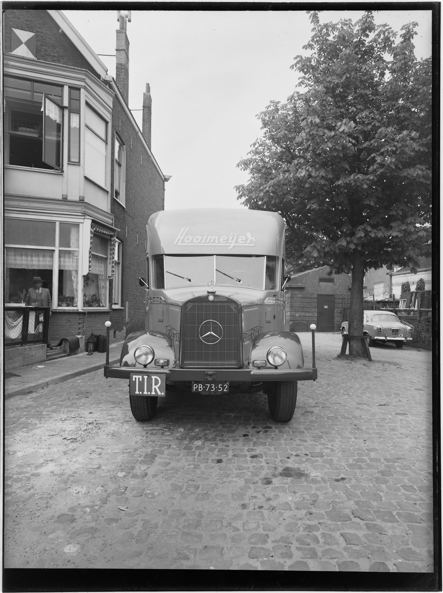 Vrachtwagen van beschuitfabriek Hooimeijer uit Barendrecht op het pleintje tussen de …