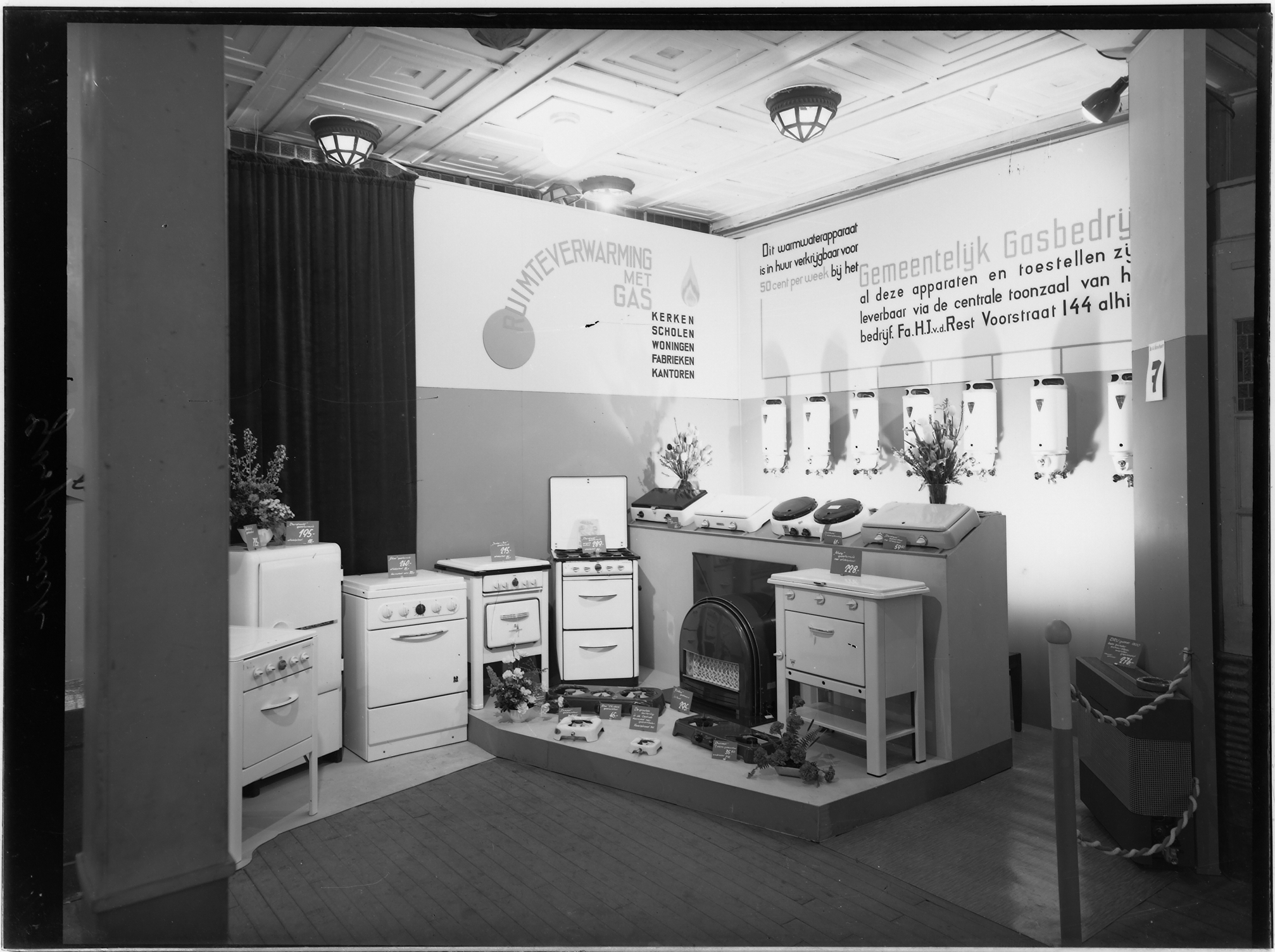 Toonzaal van het gemeentelijk gasbedrijf met gastoestellen in de vestiging van fa. H.J. v.d. Rest op de Voorstraat 144