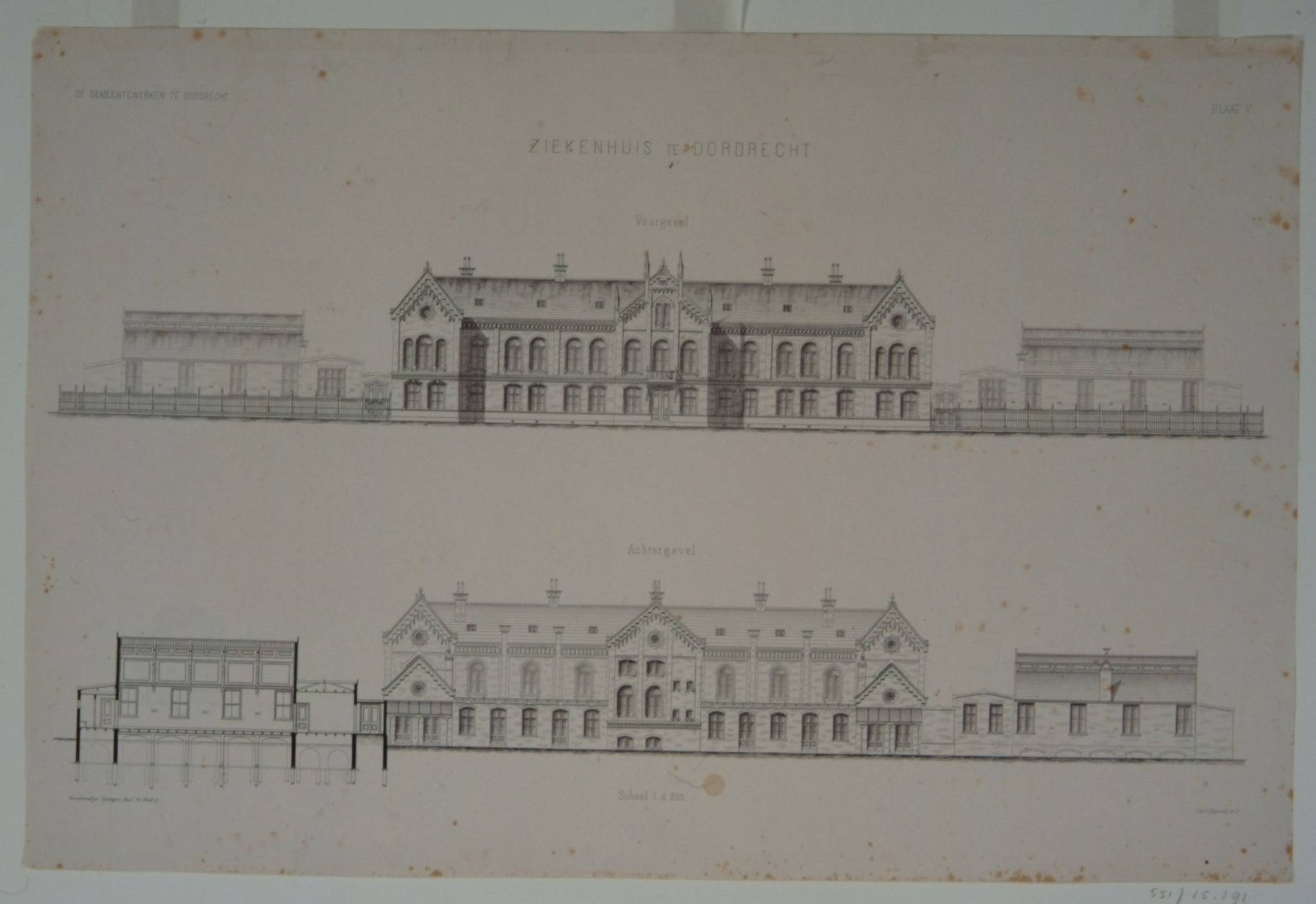 Bouwkundige tekening van de voor- en achtergevels van het Gemeentelijk Gast- of Ziekenhuis aan het Beverwijksplein, gebouwd in de periode 1875-1878..