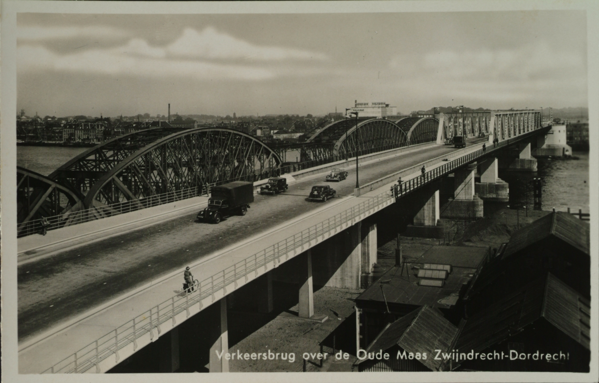 Verkeersbrug en spoorbrug over de Oude Maas, gezien richting Dordrecht. Rechts op de …