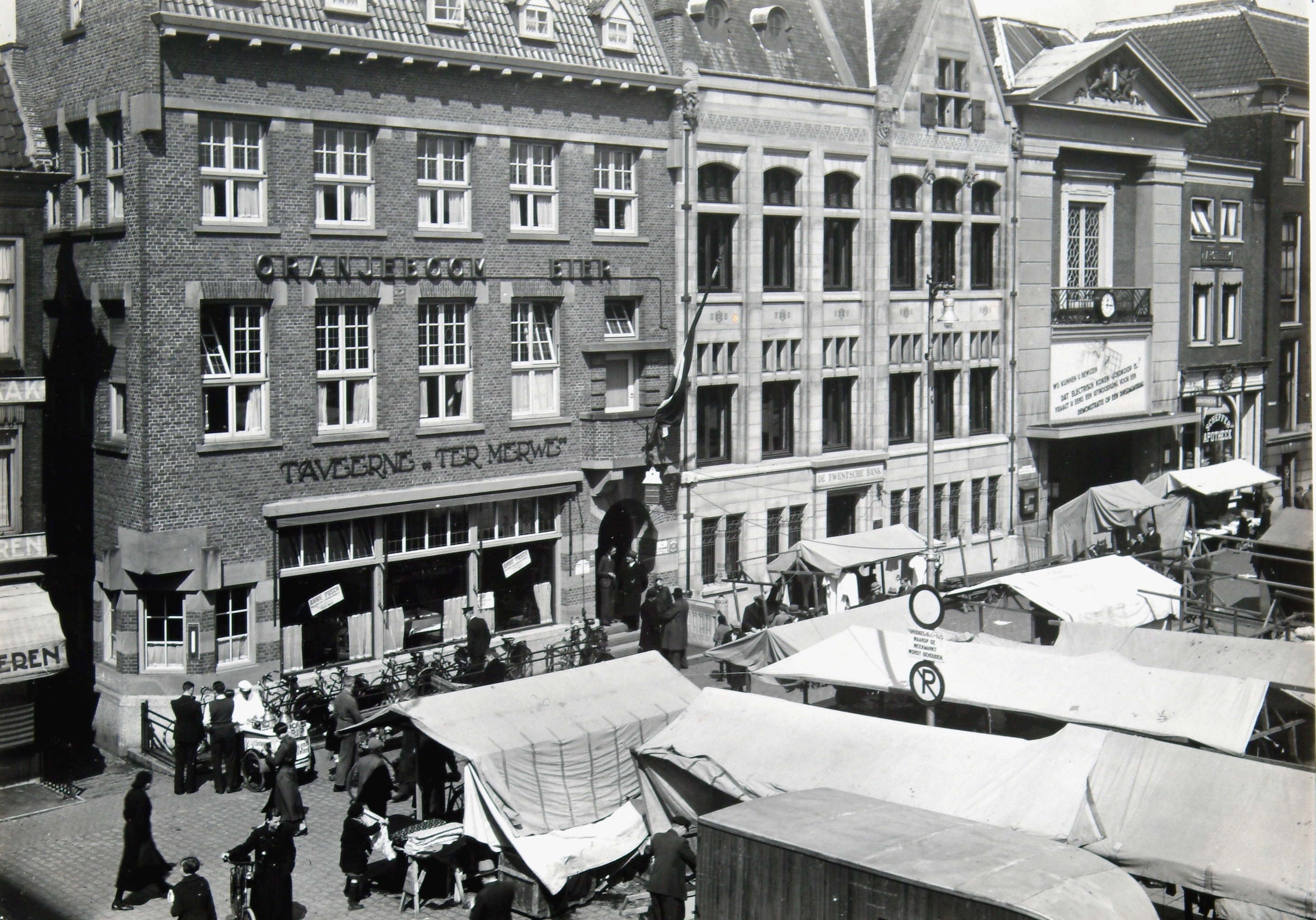 - Marktkramen op de noordwest hoek van het Scheffersplein. Rechts naast restaurant Ter Merwe is de Twentsche Bank, dan het Waaggebouw dat door het G.E.B. werd gebruikt, dan apotheek Kluit en v.d. Ven en tot slot een stukje van de christelijke H.B.S. Links van Ter Merwe is de Tolbrugstraat Waterzijde, waar een ijsventer van La Venezia klanten bedient.