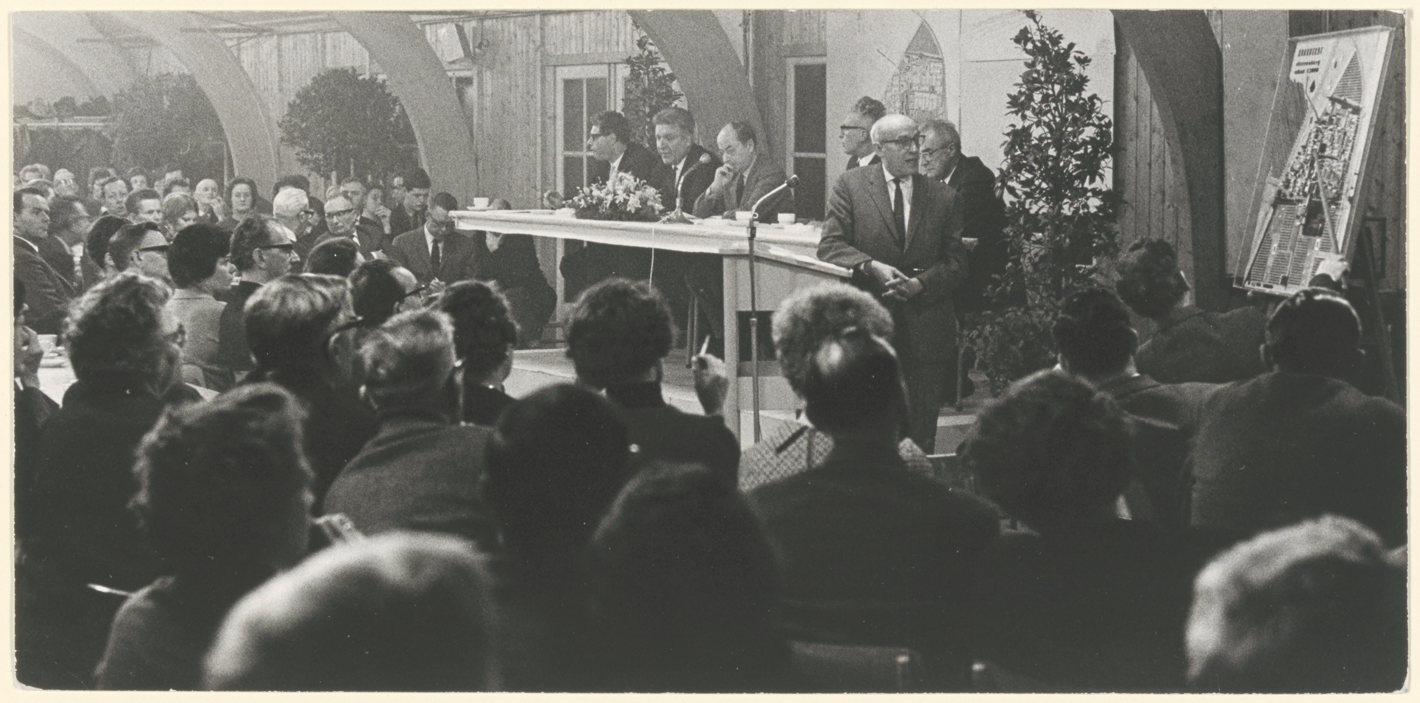 - Voorlichtingsavond in de kantine van het aannemersbedrijf C.J. Nodelijk. Wethouder L. van Bohemen legt met behulp van een maquette de toekomstige groei van de wijk Sterrenburg uit. Achter de tafel v.l.n.r. wethouders Van Zuuren, en Van Meurs, burgemeester J.J. v.d. Lee, mr. Van der Hoeven, wethouder Van Leeuwen.