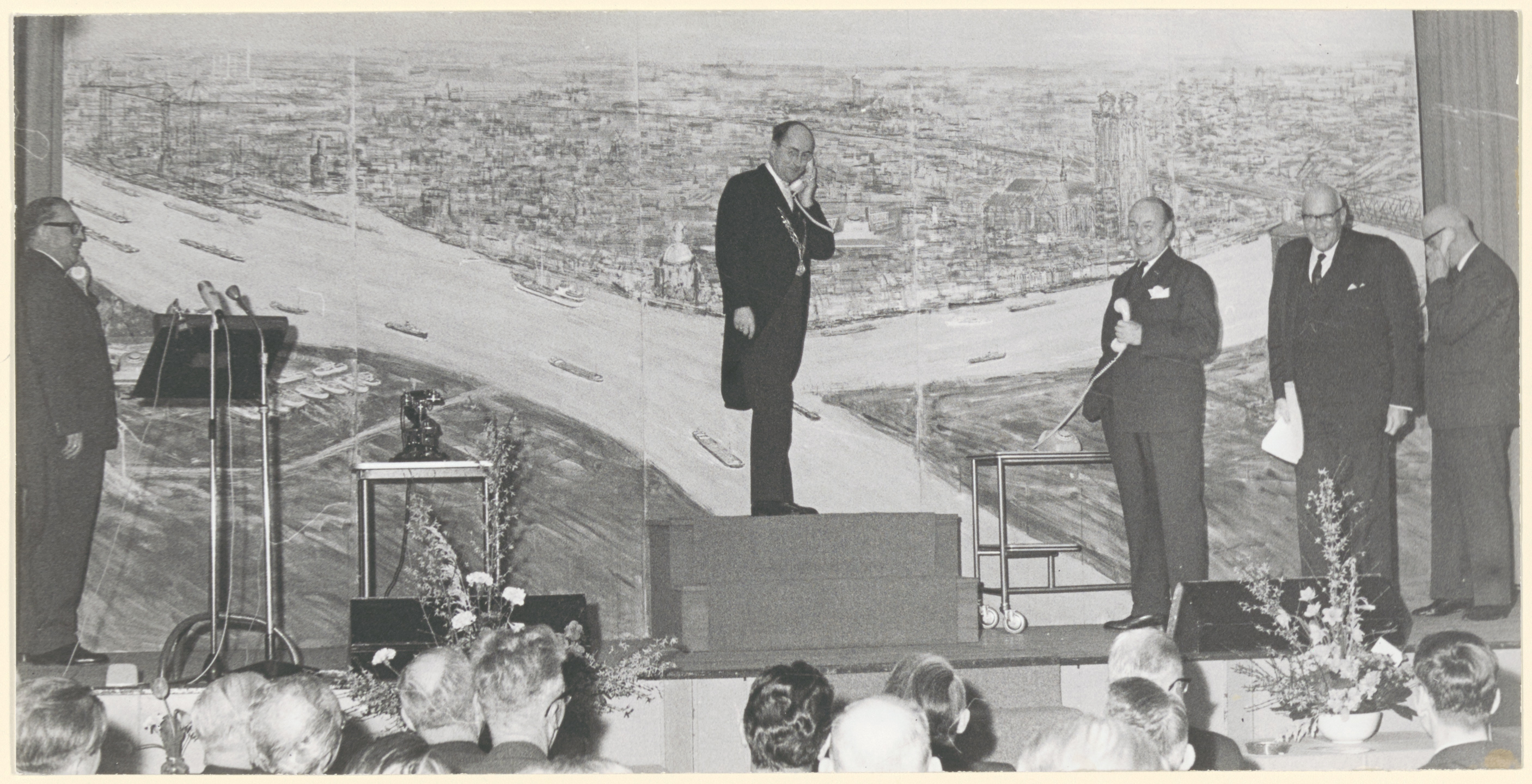 Het in gebruik stellen van de nieuwe telefooncentrale aan de Vlietweg. De burgemeesters, v.l.n.r. P.J. Keijzer, J.J. v.d. Lee, J.P.M. Beelaerts van Emmichoven en C. Slobbe telefoneren met de commissaris van de koningin mr. J. Klaasesz. Tweede van rechts dhr. J.C. Spakler, directeur van het telefoondistrict Rotterdam.