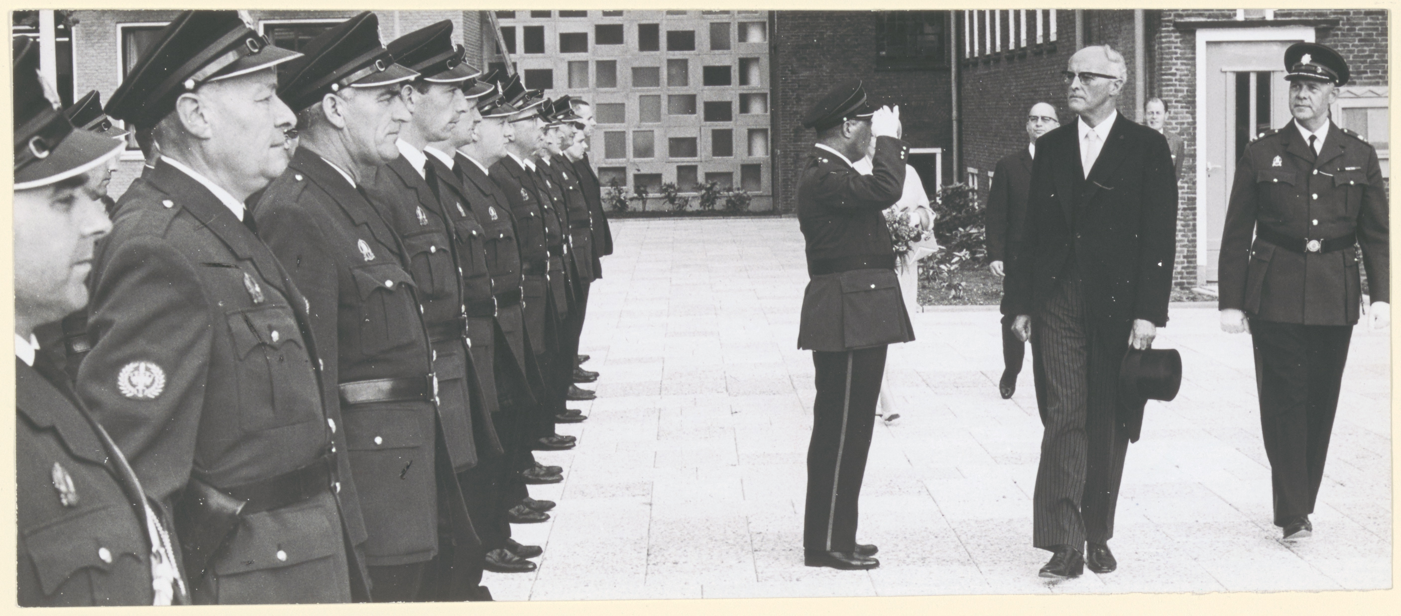 - Mr. H.H. Douma, de nieuwbenoemde burgemeester van Zwijndrecht, inspecteert het aangetreden Zwijndrechtse politiekorps bij het voormalig politiebureau en het raadhuis aan het Raadhuisplein in Zwijndrecht.