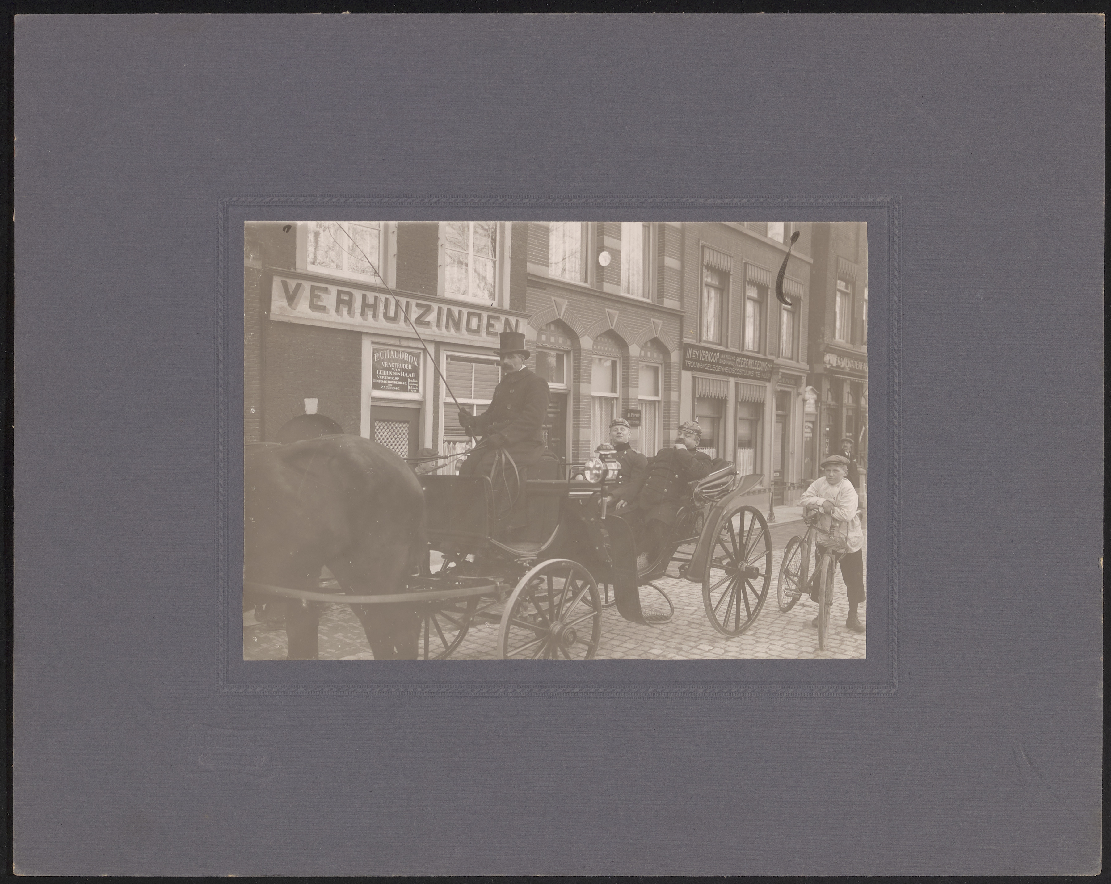 koets (verhuizingen, P. Chaudron, vragrijder van Leiden Den Haag; in en verkoop heerenkleeding, trouw en gelegenheidscostuums te huur)