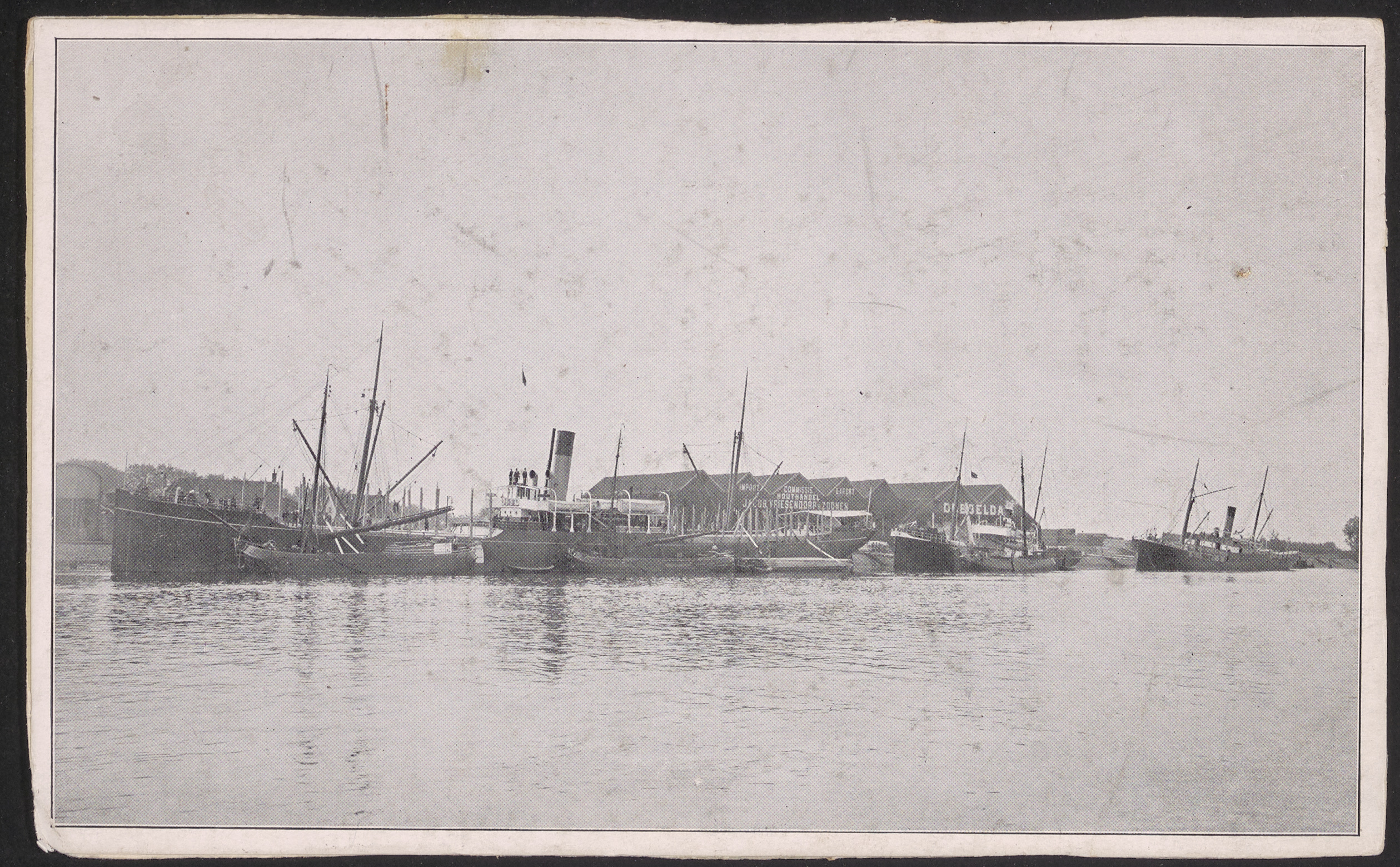 Schepen voor de werf van de firma Jacob Vriesendorp & Zoonen aan de ‘s-Gravendeelsedijk, destijds Dubbeldam. Links wordt hout overgeslagen van schip naar schip. houthandel import export commissie