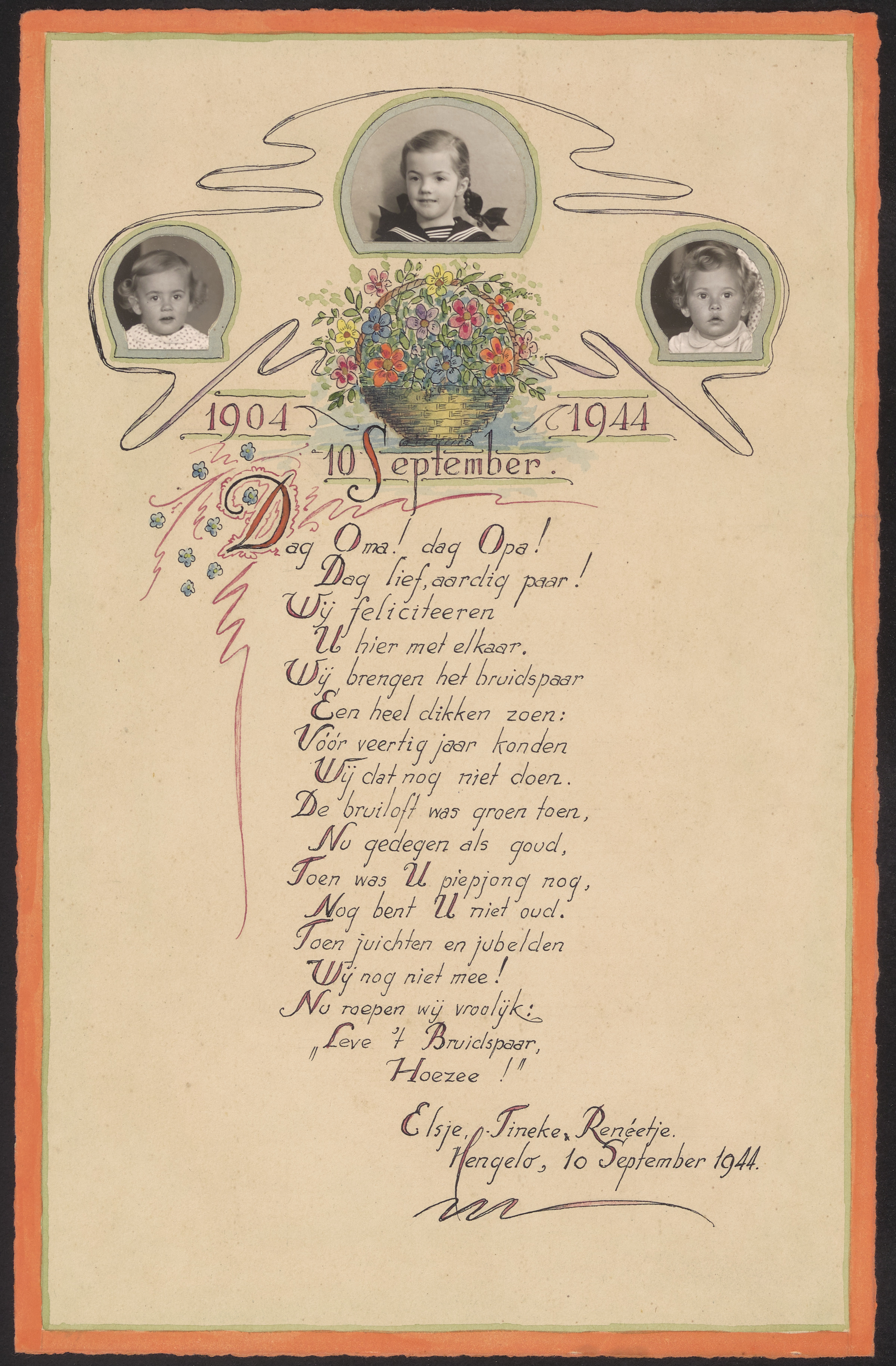 Ter gelegenheid van het 40 jarige huwelijksfeest van Cornelis Engelbert Adriaan Marie Bierens en Elisabeth Constantia Joanna Lips. ‘Elsje’ is Elisabeth Anna Maria Vriesendorp (1937), ‘Tineke’ is Albertina Johanna Maria Vriesendorp (1942), de twee kinderen van David Anton Nicolaas Vriesendorp (1905-1987) en Anna Antonia Elisabeth Maria Bierens.