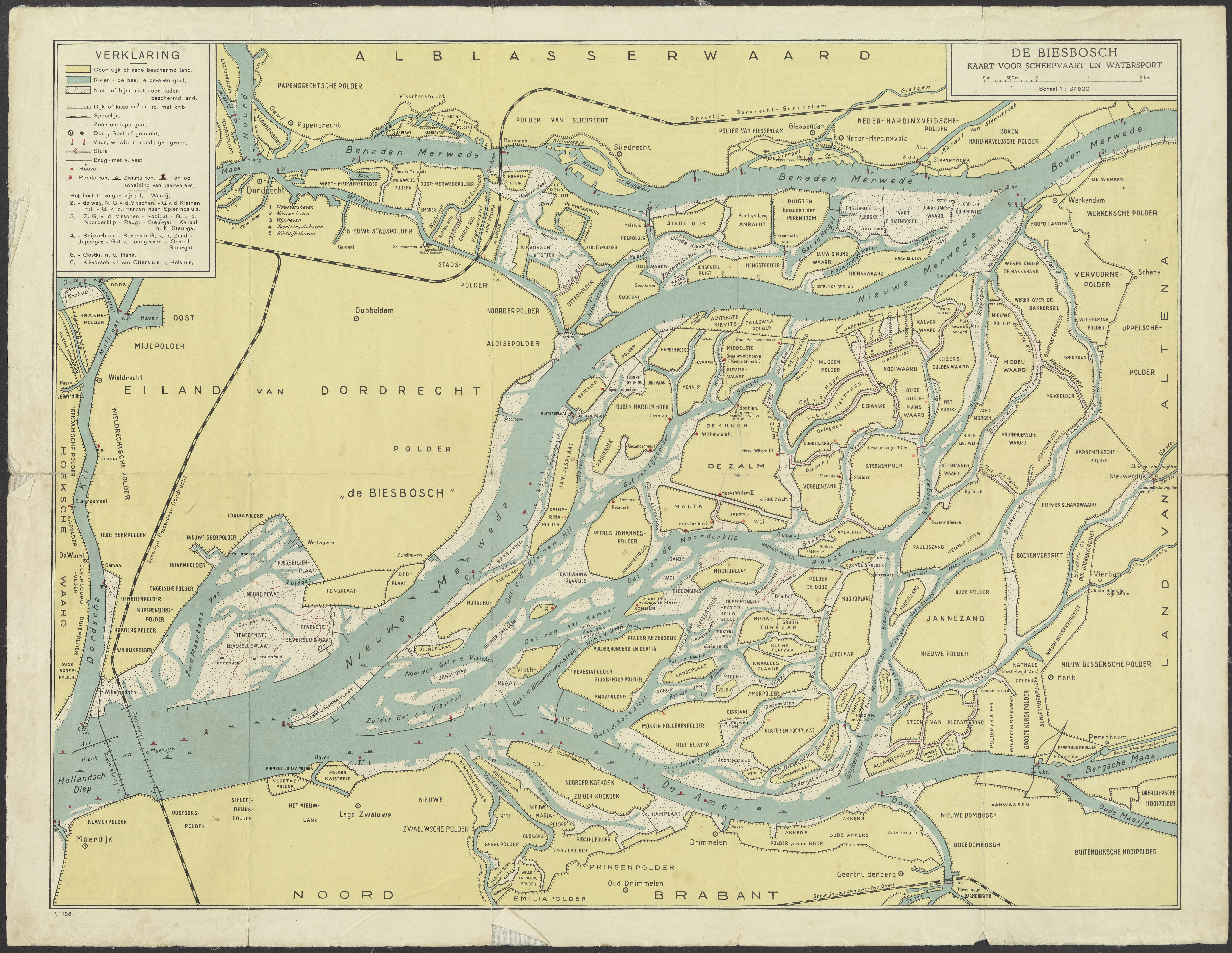 Geen datering aanwezig, maar op basis van aanwezige polders dateer ik deze kaart tussen 1926 (aanleg Biesboschpolder) en 1954 (aanleg dijk langs de Amer)