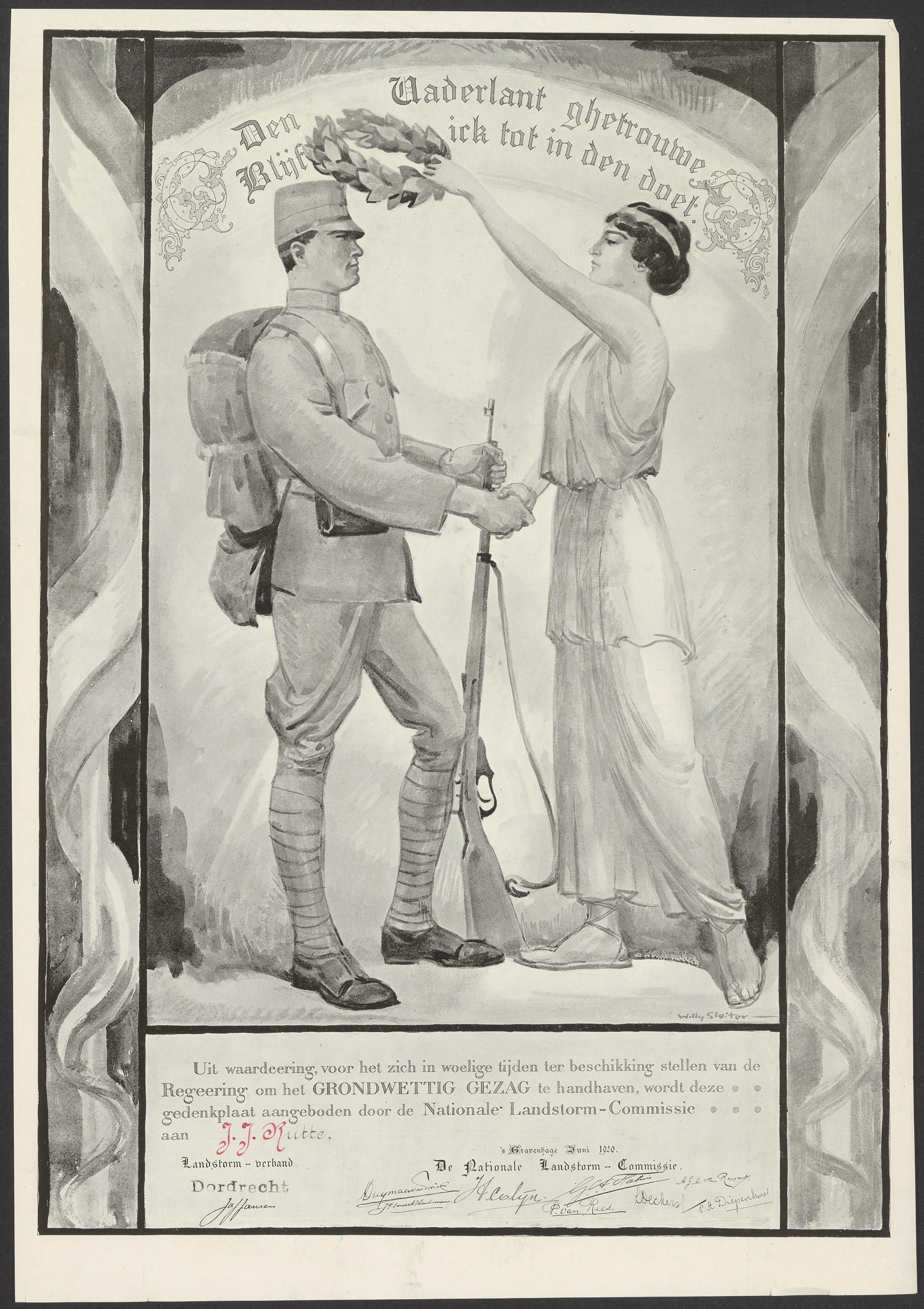 (getuigschrift, tekening Willy Sluiter) DEN VADERLANT GHETROUWE BLIJFT ICK TOT IN DEN DOET, uit waardeering voor het zich in woelige tijden ter beschikking stellen van de regeering om het grondwettig gezag te handhaven, wordt deze gedenkplaat aangeboden door de Nationale Landstormcommissie aan J.J. RUTTE, 's Gravenhage 1920, J.A.J. Jansen (Dordrecht), Colijn, van Rees, Deckers, Diepenhorst, van Rappard.