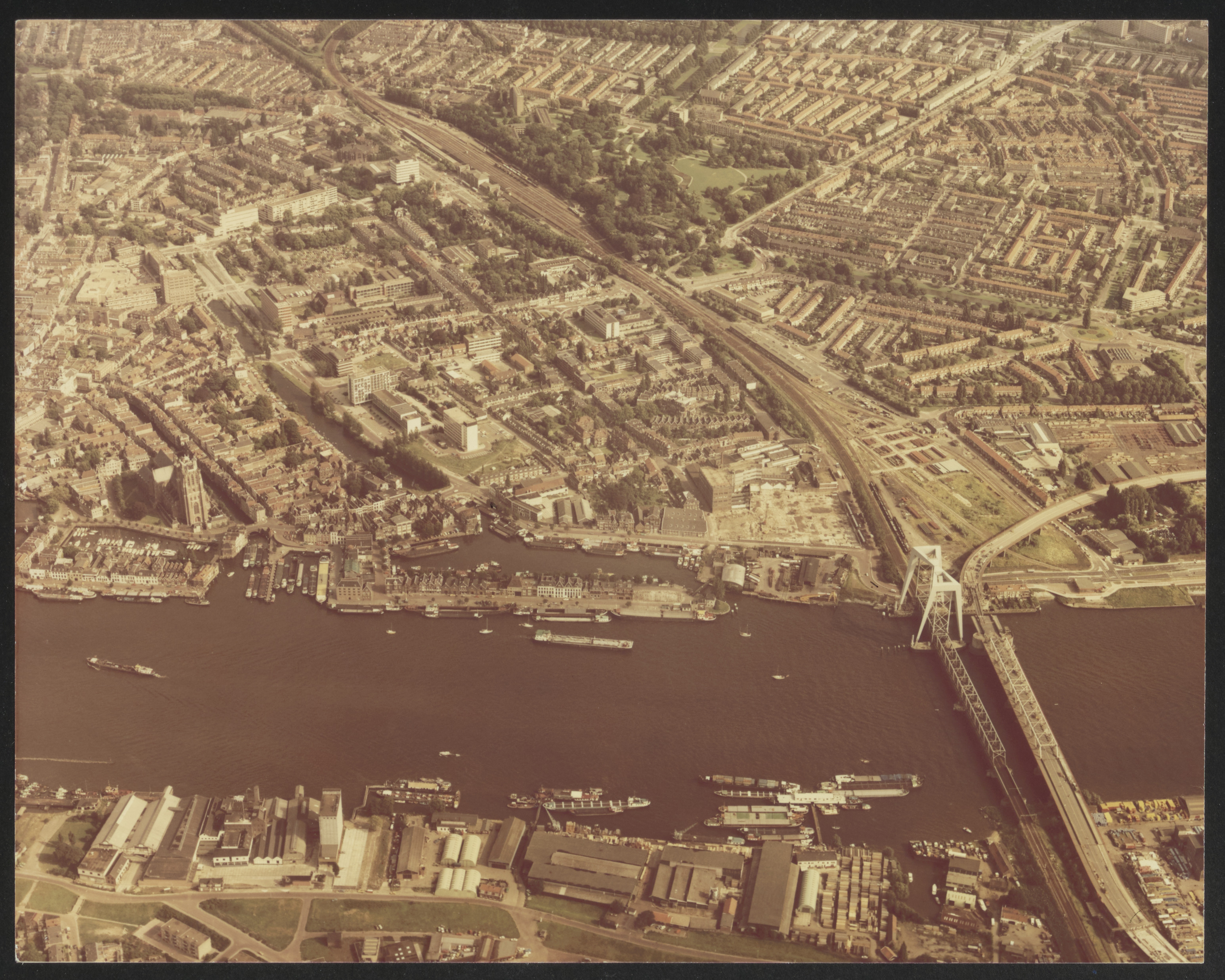 (2347/4045) luchtfoto Oude Maas, Zwijndrechtse brug, Krispijn, Wilgenbos, Weeskinderendijk, Kalkhaven, Grote Kerk, Bomhaven, Maartensgat, oever Zwijndrecht, spoorlijn, station Dordrecht, Weizigtpark, Paulusplein, Amalia van Solmsstraat, Nassauweg, Nassauvijver, Krispijnseweg, Marnixschool, St. Antoniuskerk