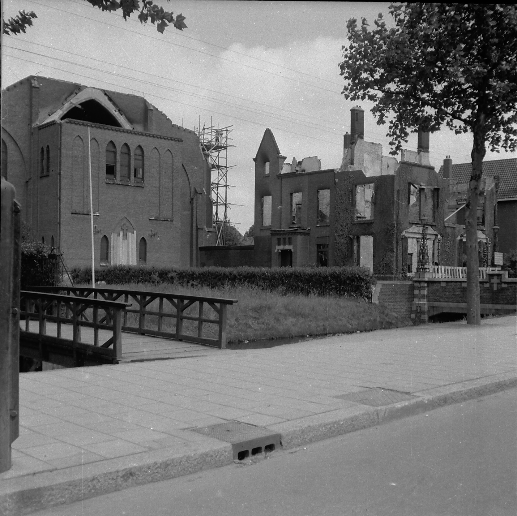 Vanaf de Burg.de Raadsingel zicht op rechts de vernielde Pastorie van de R.K. Antoniuskerk links in mei 1940.