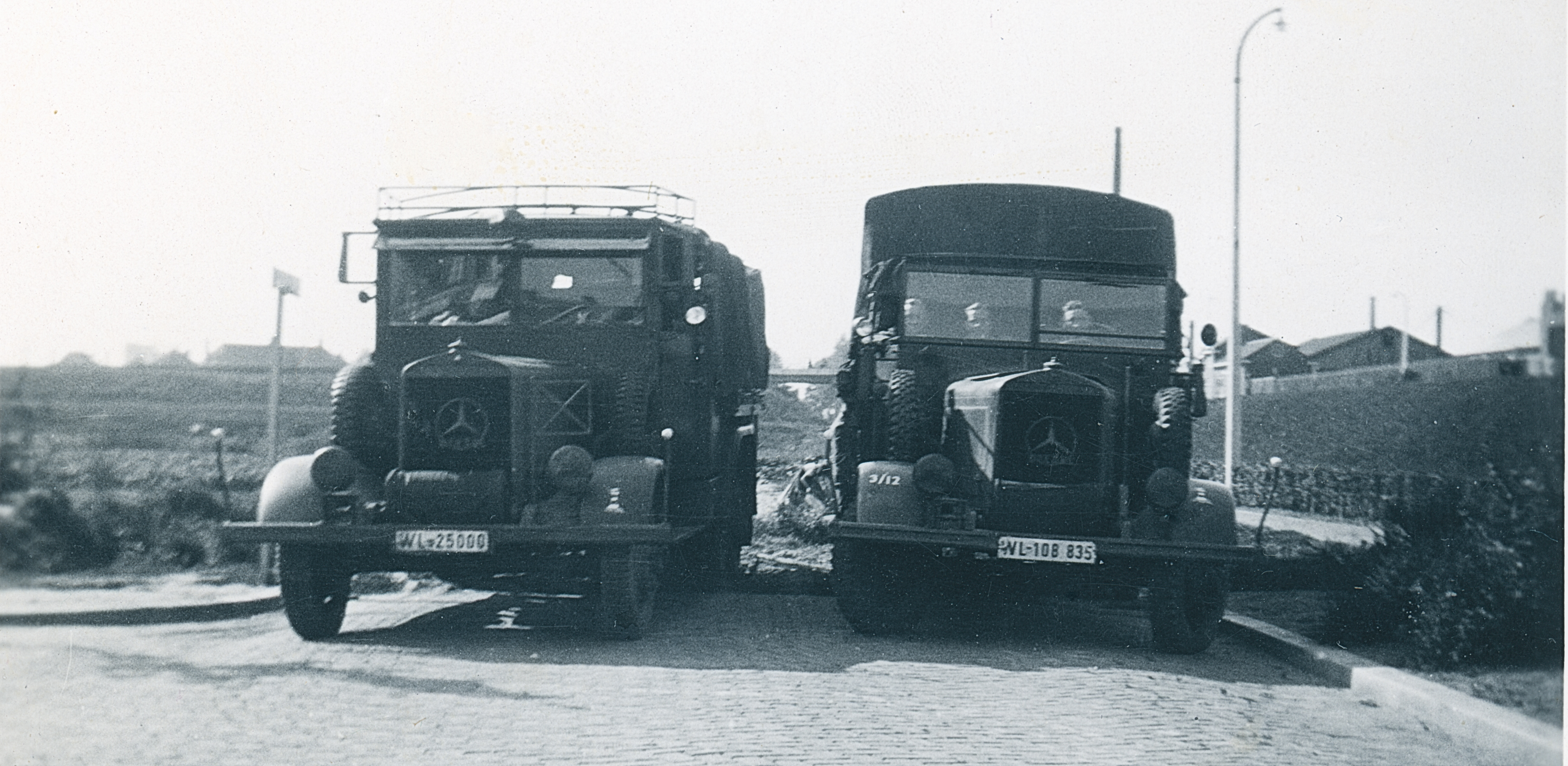 Deze voor mij bekende foto is van augustus 1940. Afgebeeld zijn twee Duitse Mercedes-Benz G3A legerwagens van de Luftwaffe. Links naast de vrachtwagens staat het straatnaambordje Brandts Buystraat. De lantaarnpalen rechts staan langs de Weeskinderendijk Beneden. Tussen de trucks is de oprit naar Zwijndrecht te zien. De mannen hielden vanuit deze plek het doorgaande verkeer in de gaten zonder een obstakel te zijn. Buiten beeld links stond het toen fonkelnieuwe Sportfondsenbad. Zie eventueel afbeelding 555_14827.