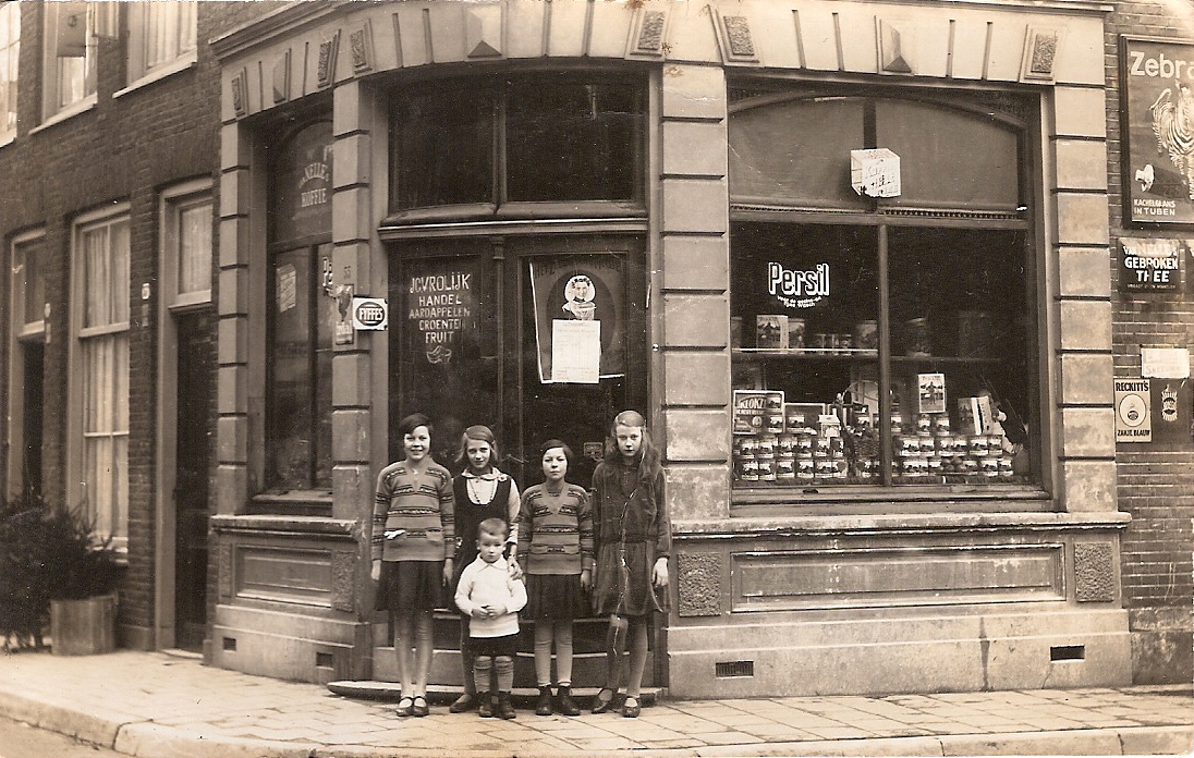 Zie 552_802412 (identiek): Aardappel- en groentehandel van J.G. Vrolijk, Noordendijk 55, op de hoek van het Matena's Pad (rechts).
