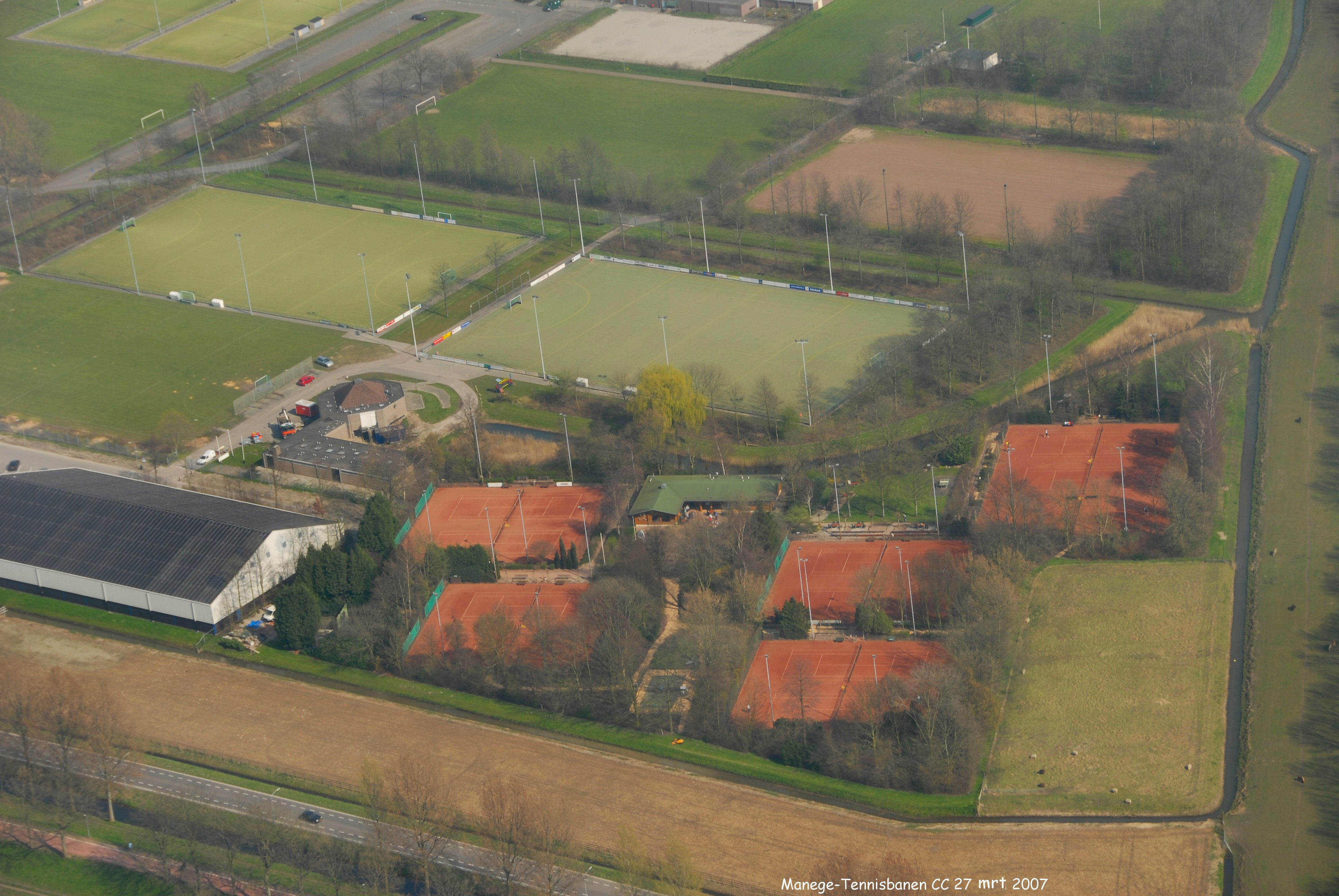 Links de tennishal Schenkeldijk met met rechts de banen van CC, onder is de Schenkeldijk, boven de tennishal is de Mixed golfclub DMHC. mrt.2007