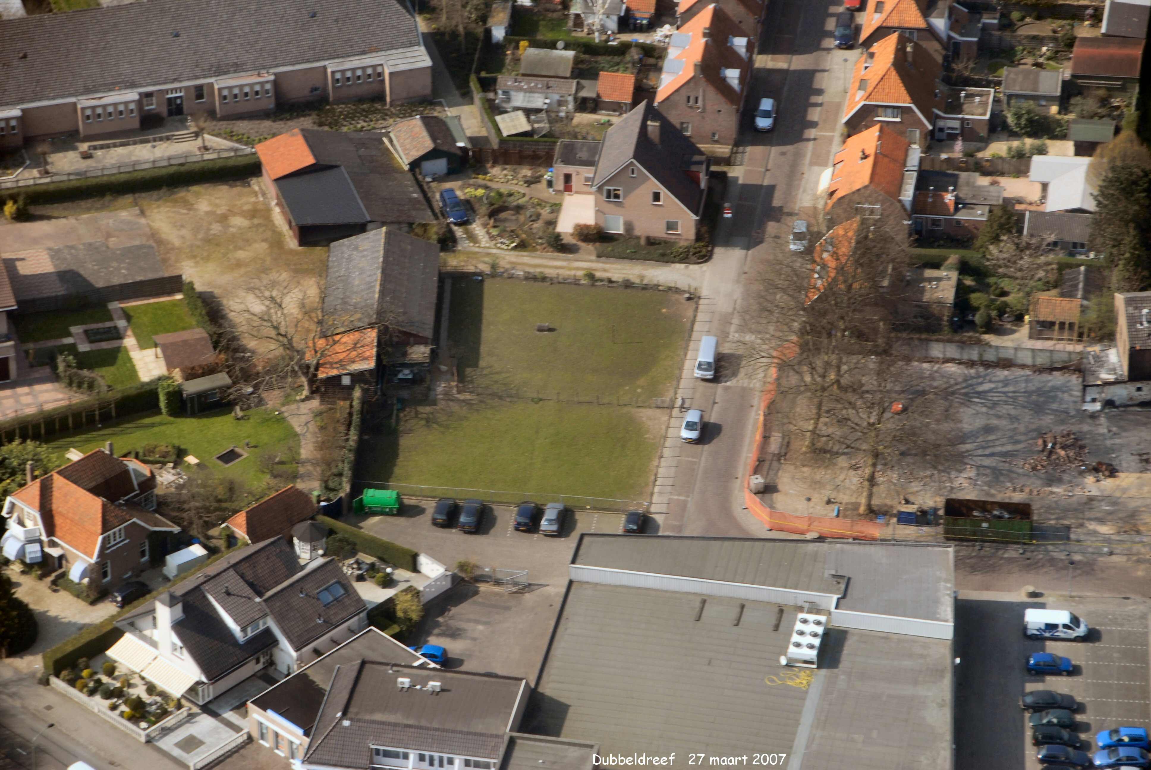 Links onder nog een stukje van de Dubbelsteynlaan.Rechts onder is de Plusmarkt. Links boven de oude school 1. met de Dubbeldreef in het midden.