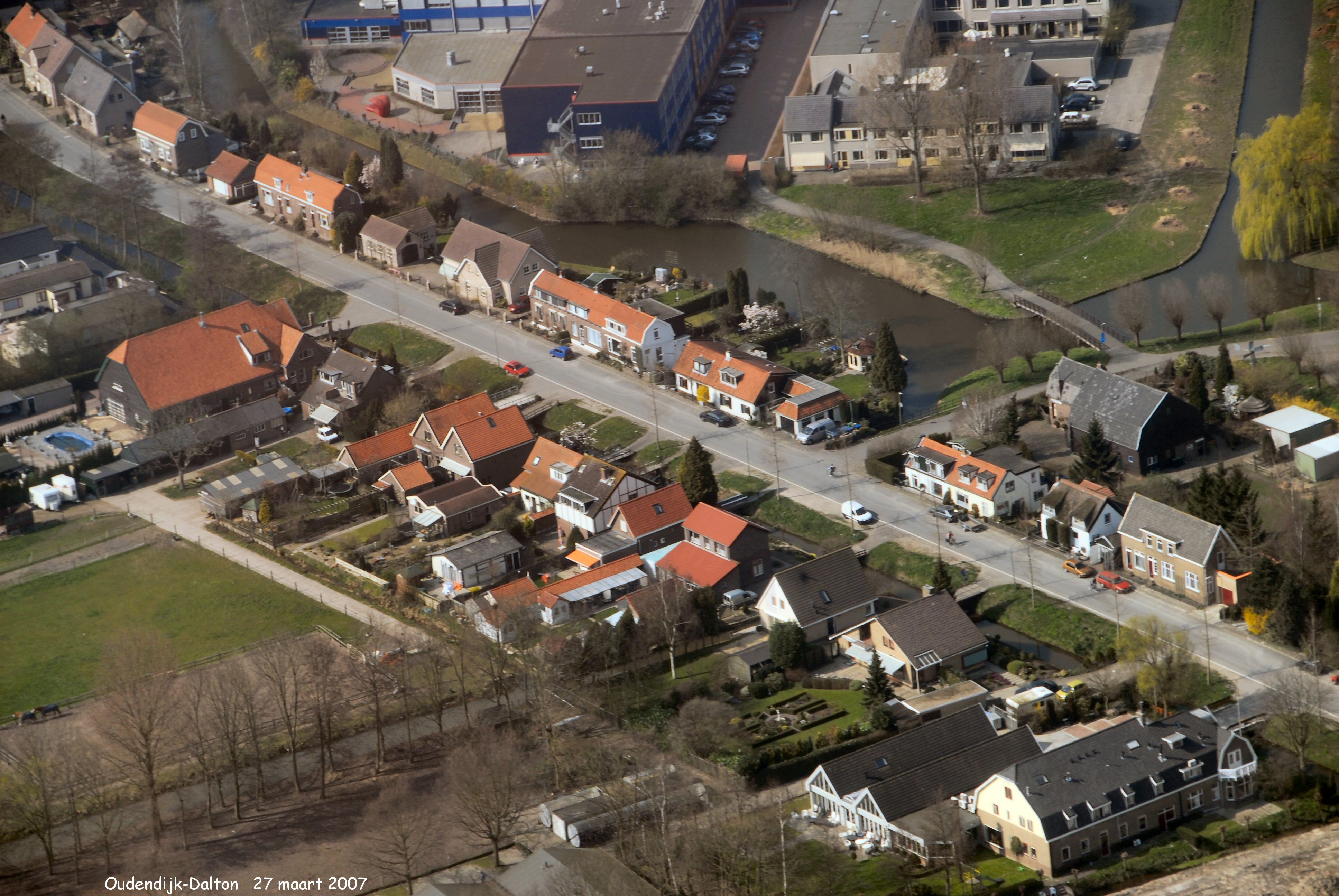 Oudendijk met rechts onder boerderij "Valkenhof" bovenaan het Stedelijk Dalton College.