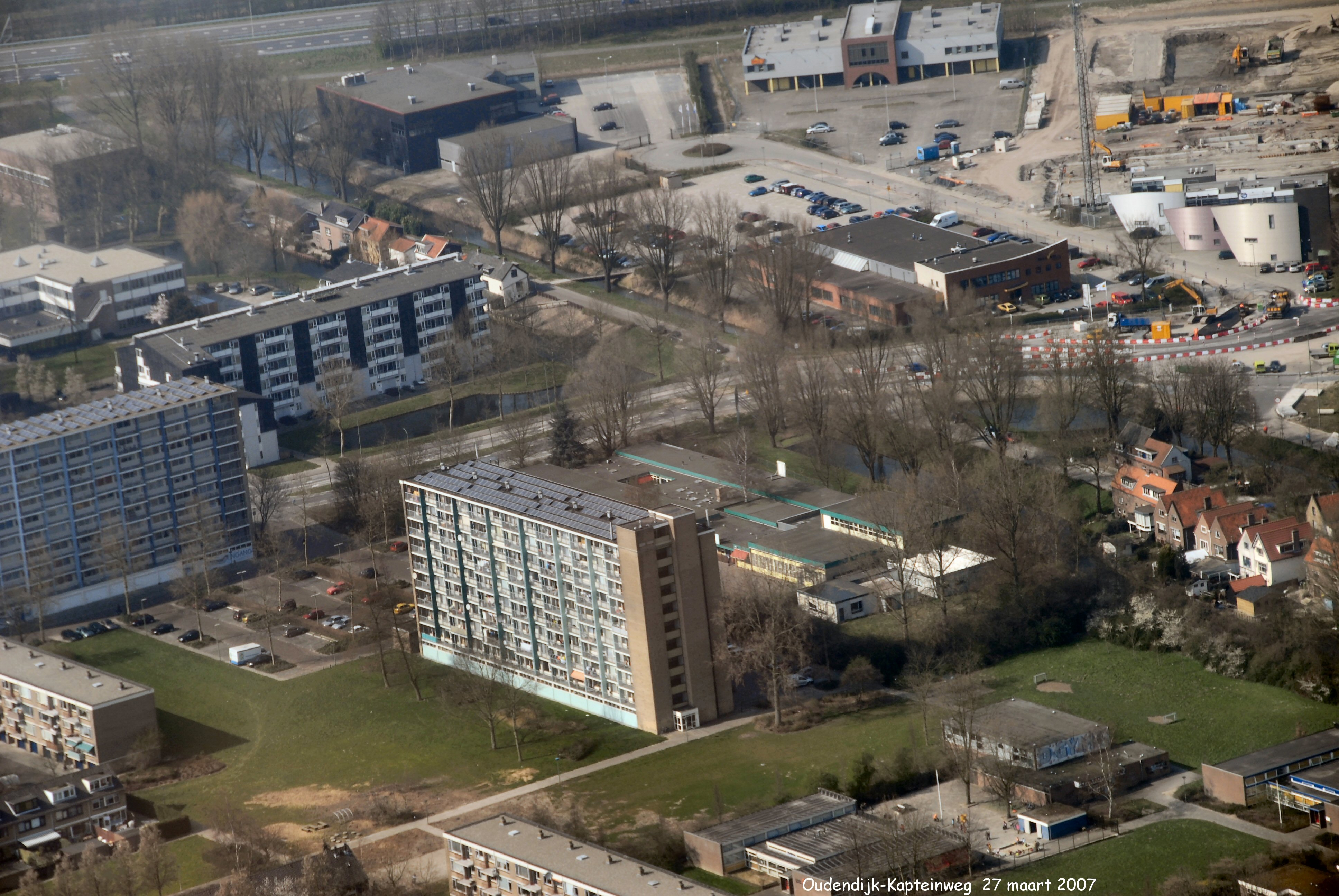Oudendijk met naar links de Kapteinweg. Op de achtergrond de Rondweg.