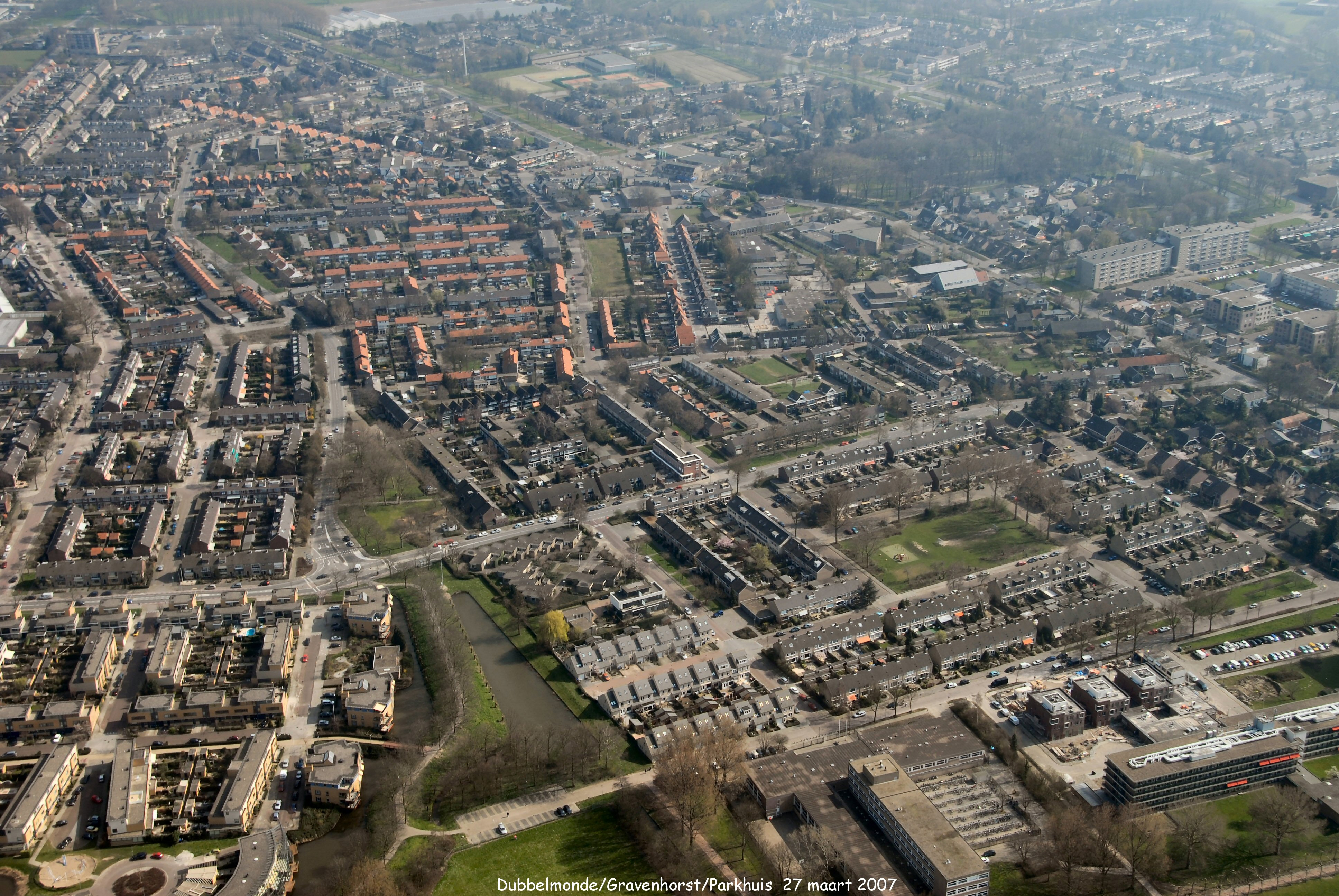 Onder is de Koningstraat met Dubbelmonde en rechts er van het Insula College. Links boven het Parkhuis Midden links naar rechts is de groene Kruislaan Rechts boven is de Gravenhorst aan de Vijverlaan.