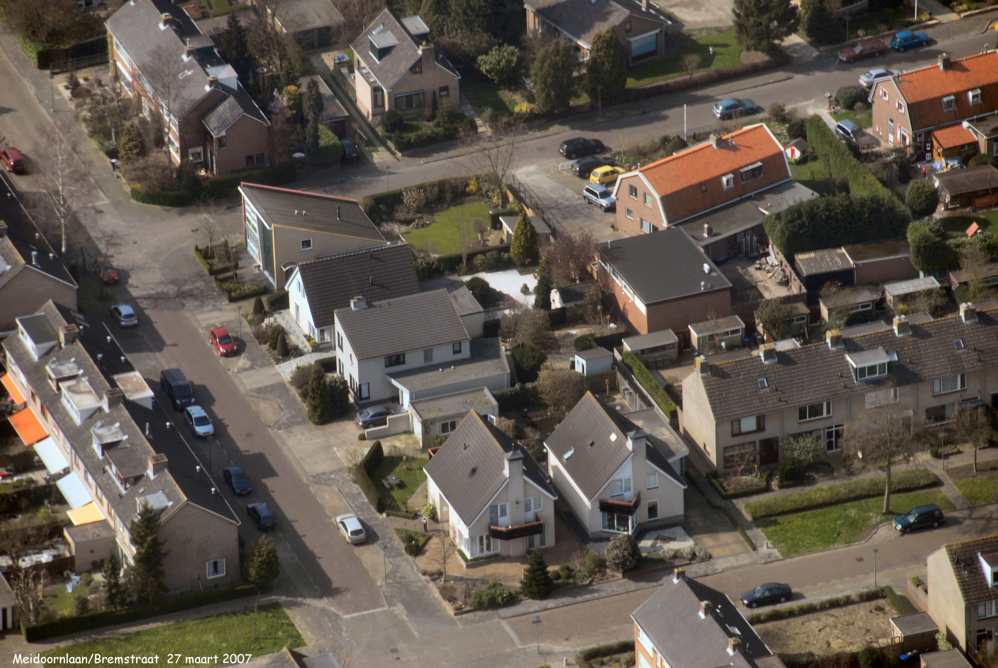 Links is de Meidoornlaan met boven de Bramstraat, onder de Jasmijnstraat gezien in Westelijke richting.