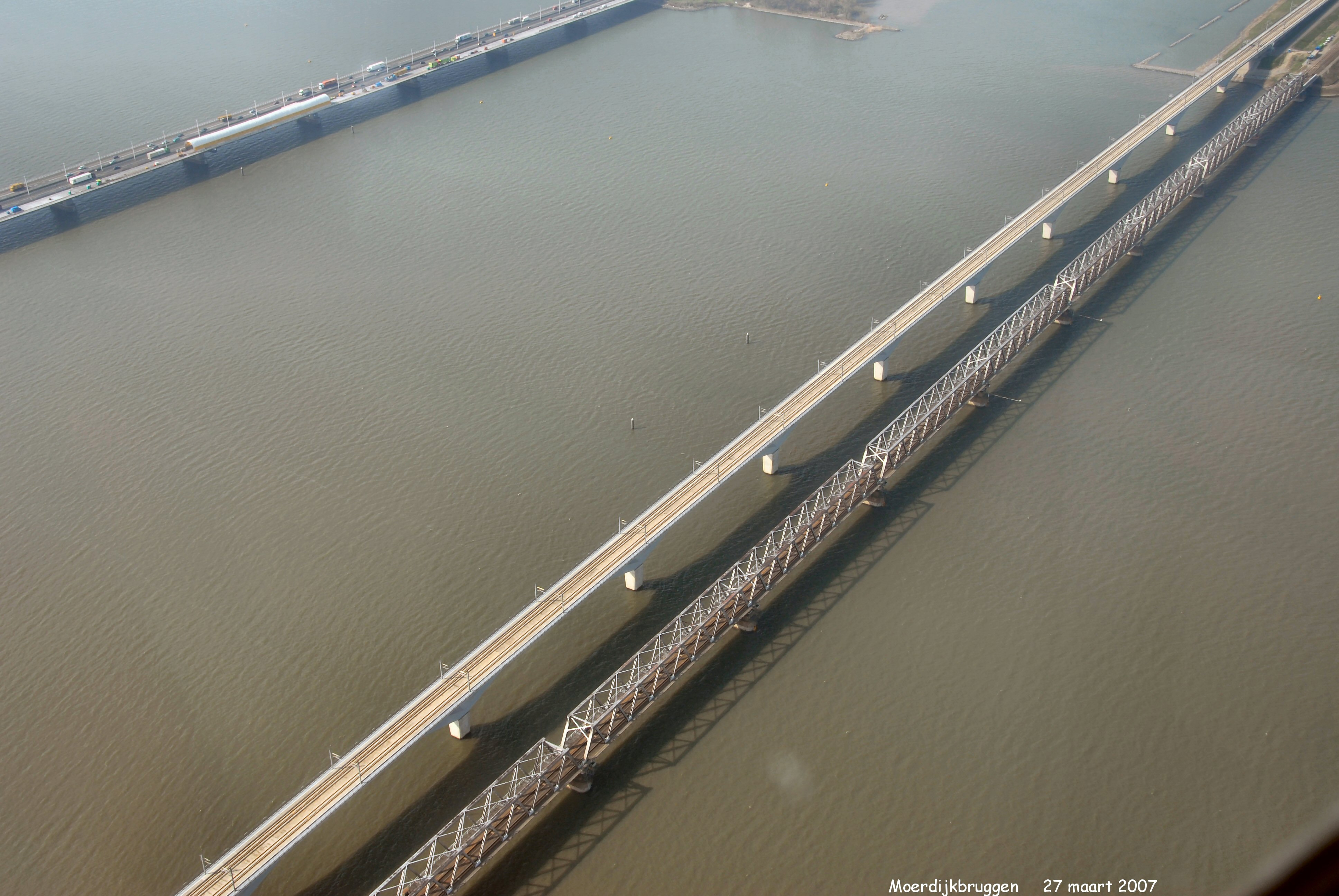 Links de Verkeersbrug en rechts de spoorbruggen gezien in Noord/Westelijke richting.
