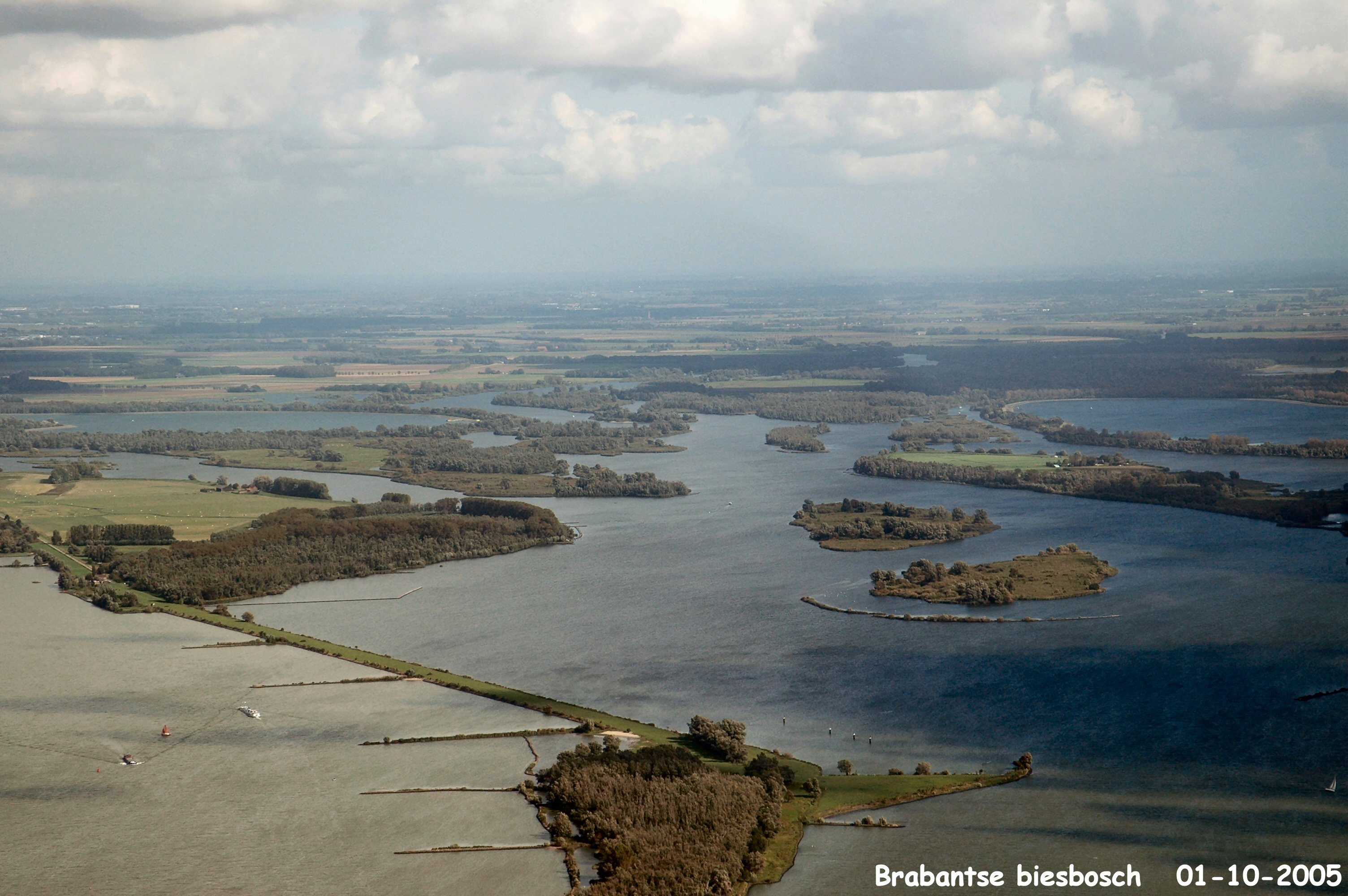 Brabantse Biesbosch met links onder de Nieuwe Merwede, midden onder nog een stukje van de Anna Jacominaplaat. gezien in Noord/Oostelijke richting.