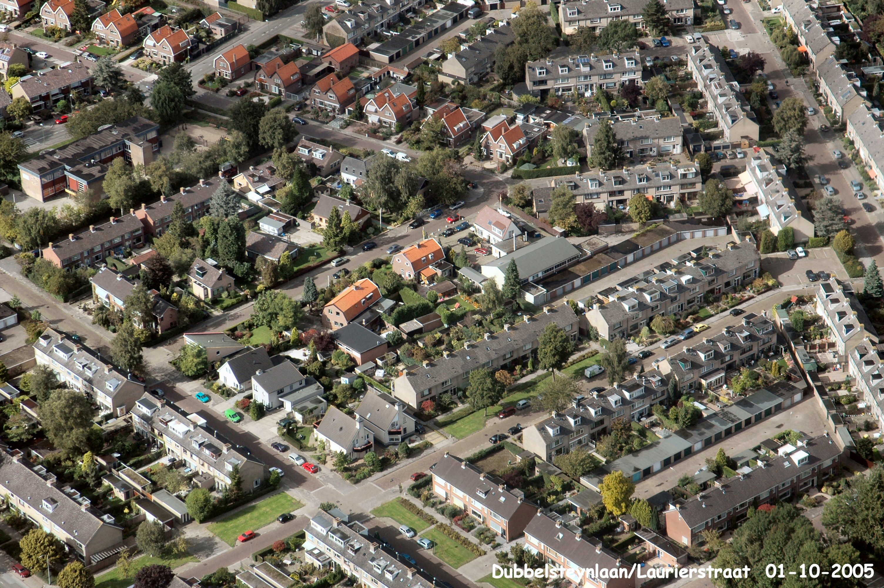 Links onder is de Dubbelsteynlaan en rechts boven is de Laurierstraat. Links boven is Kromme Zandweg.